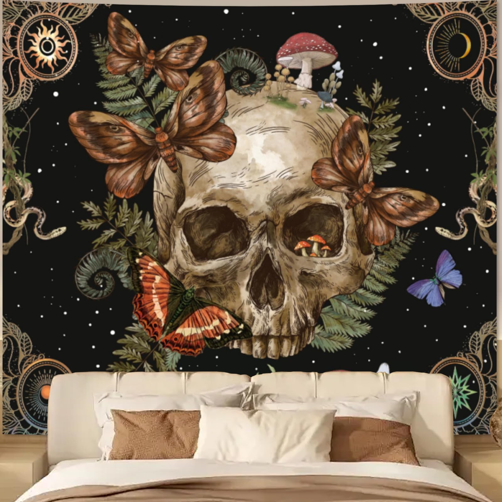 Avinyl Tapiz gótico vintage para dormitorio, estético, tapiz de pared floral de calavera gótica, mariposa, esqueleto, hongos, poli