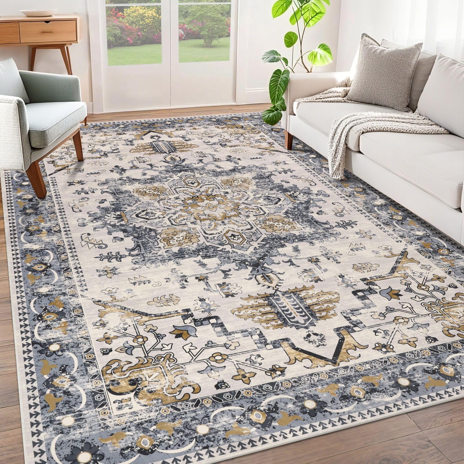 Alfombra de área lavable de 5 x 7, alfombra vintage para sala de estar, suave, de pelo bajo, no se desprende, fácil de limpiar, la