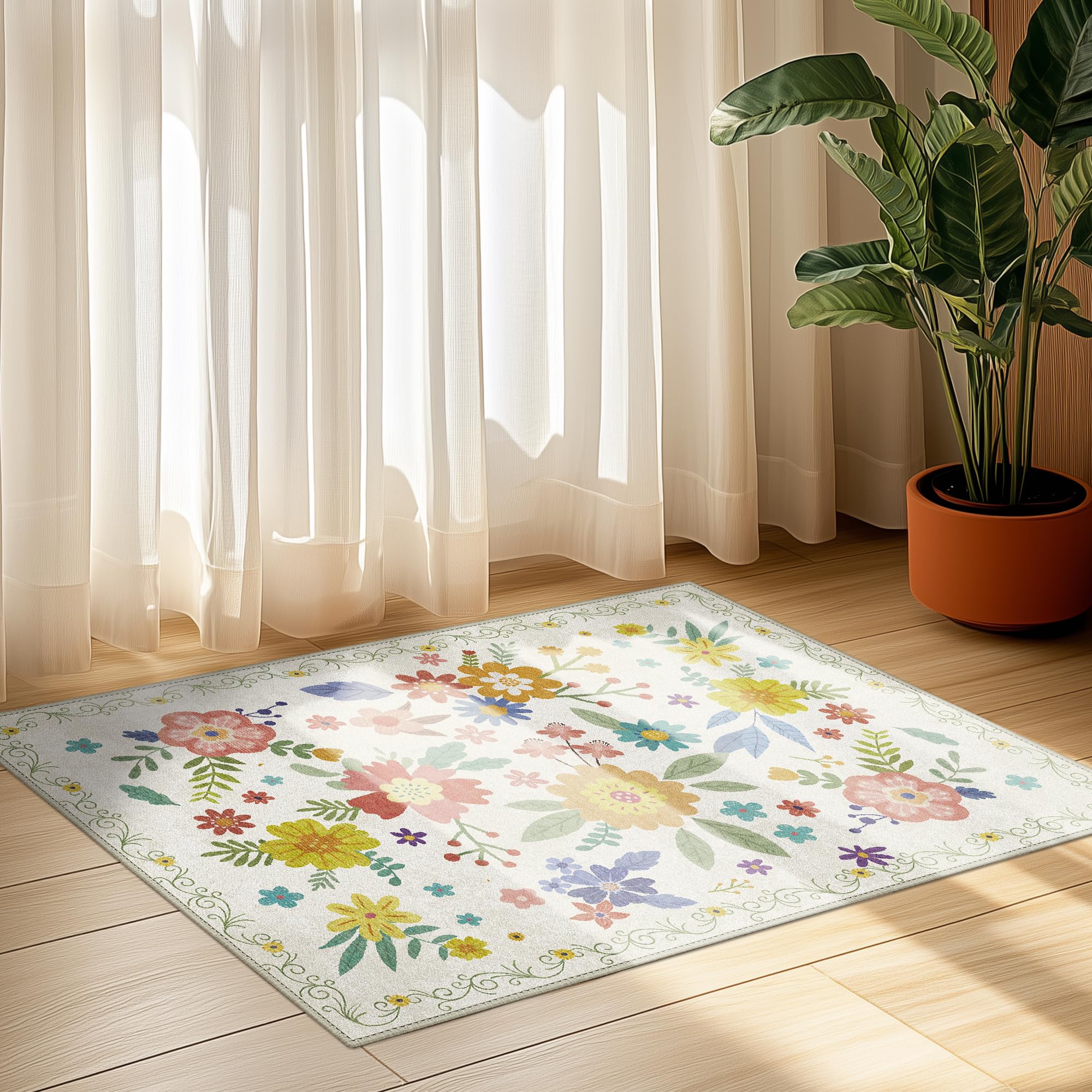 jinchan Alfombra floral de 3 x 5 pies, lavable a máquina, ultrafina, suave, de pelo bajo, antideslizante, vintage, botánica, estét