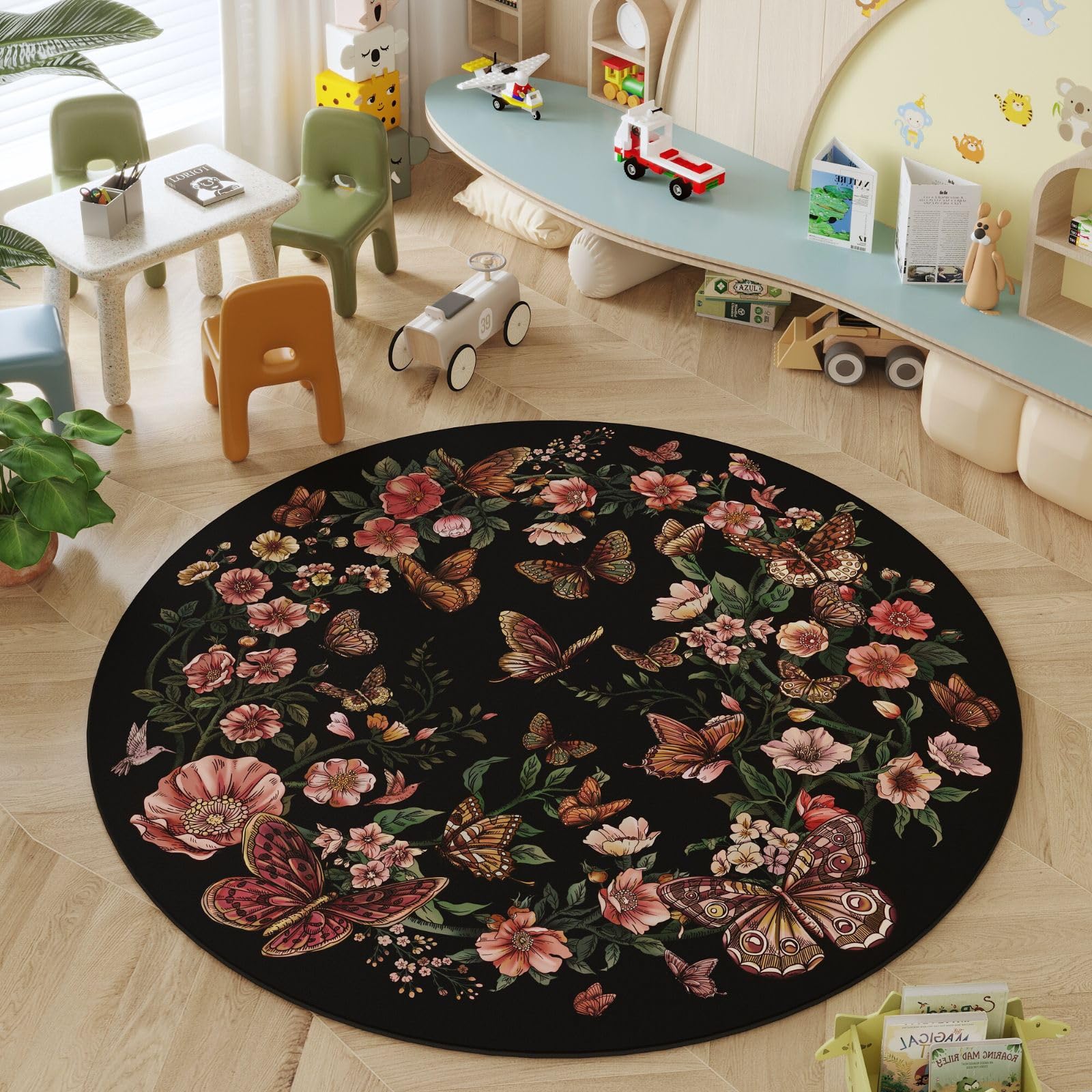 Alfombra redonda lavable de 4 pies, antideslizante, de pelo bajo, bohemio, floral, mariposa, pequeña, circular para dormitorio, ba