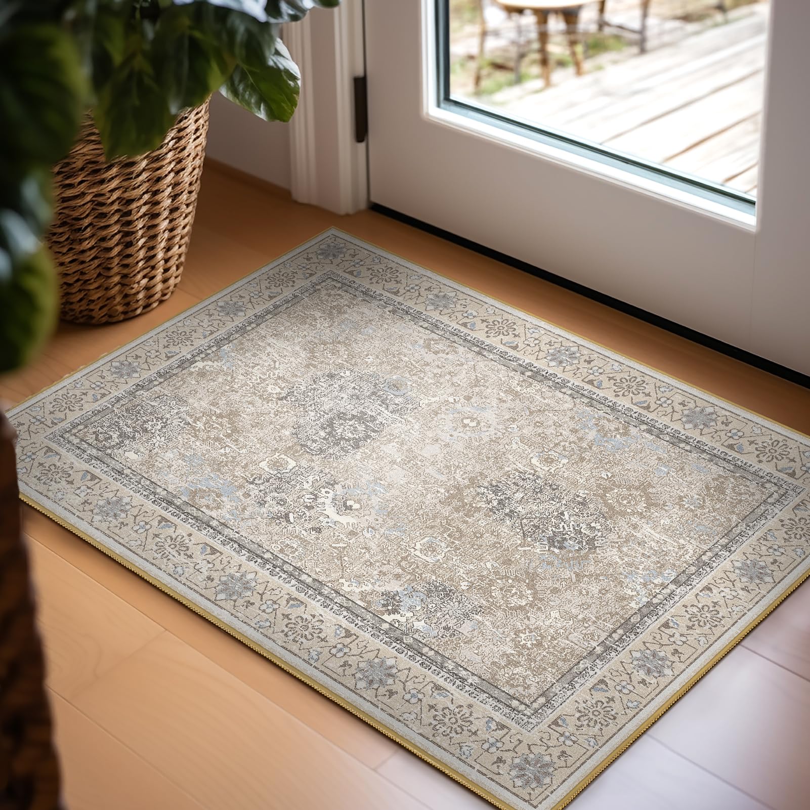 Ashler – Alfombra de entrada vintage de 2 x 3, alfombras bohemias para entrada, dormitorio, cocina, beige/natural/café claro, deco