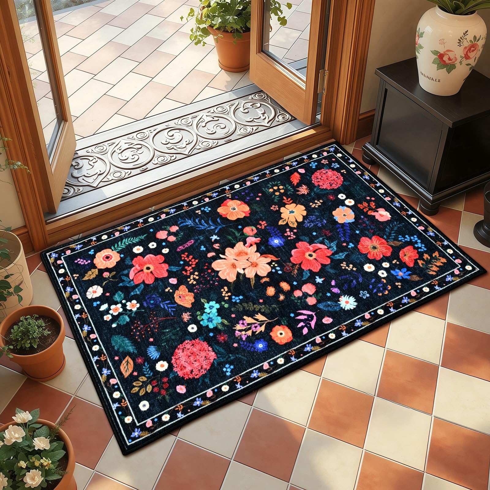 Alfombra floral pequeña de 2 x 3 para entrada, alfombras lavables con respaldo antideslizante para dormitorio de niñas, cocina, bo