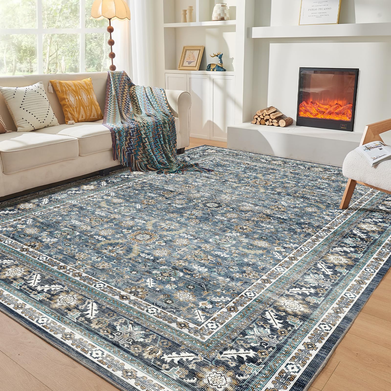 OPPODREAM Alfombra vintage azul de 5 x 7, 5 x 7 pies, retro, lavable, antideslizante, de lana sintética, de pelo corto, suave y en