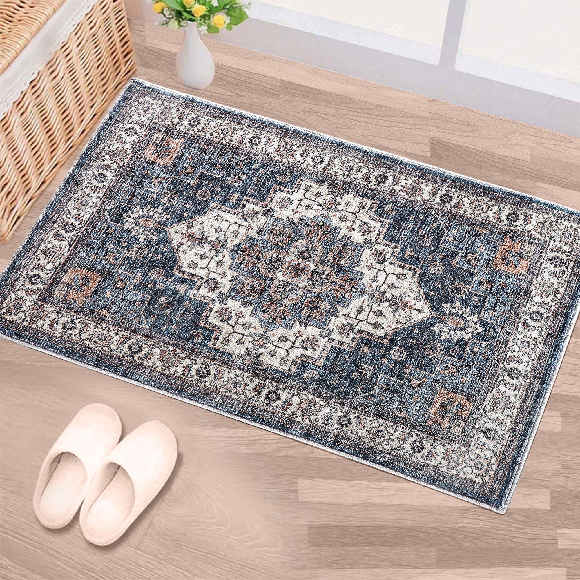 Alfombra lavable de 2 x 3 pulgadas, color gris, azul, blanco, para entrada, alfombra bohemia de pelo bajo, alfombra suave antidesl