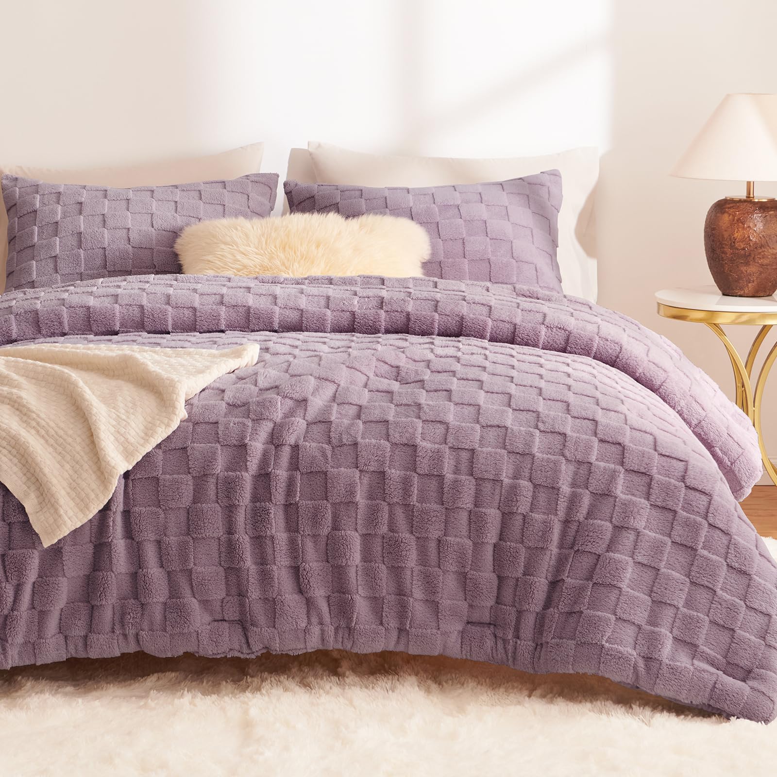 CozyLux Juego de edredón de tamaño Queen, color morado claro, edredón de forro polar esponjoso con patrón a cuadros, juego de cama