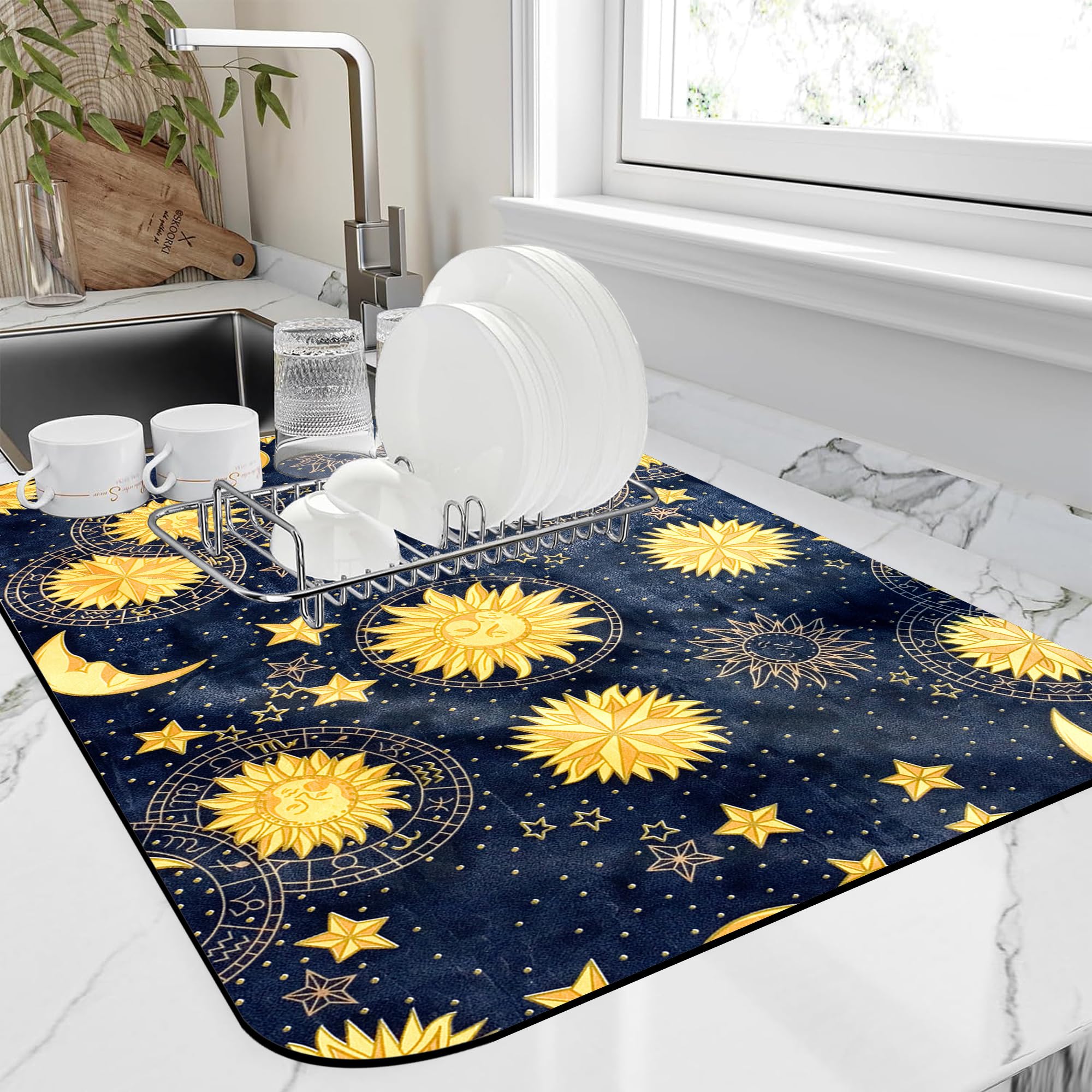 Tapete de secado de platos, de tela colorida, sol, luna, estrellas, tapete de cocina de 12 x 19 pulgadas, tapete para cafetera Bso