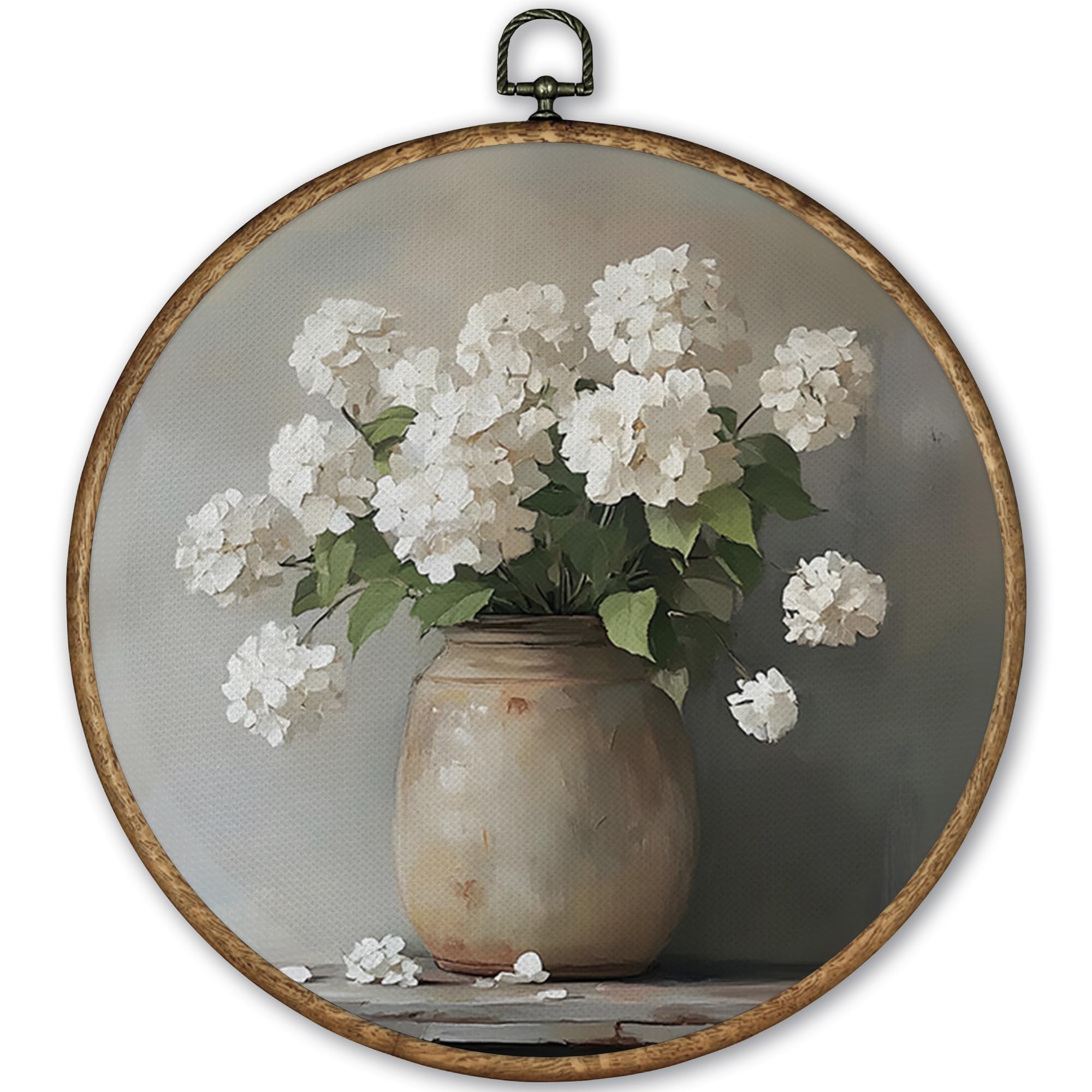 TLESKE Decoración redonda de hortensias blancas vintage enmarcada de 10 x 10 pulgadas, lienzo floral de primavera, obras de arte,