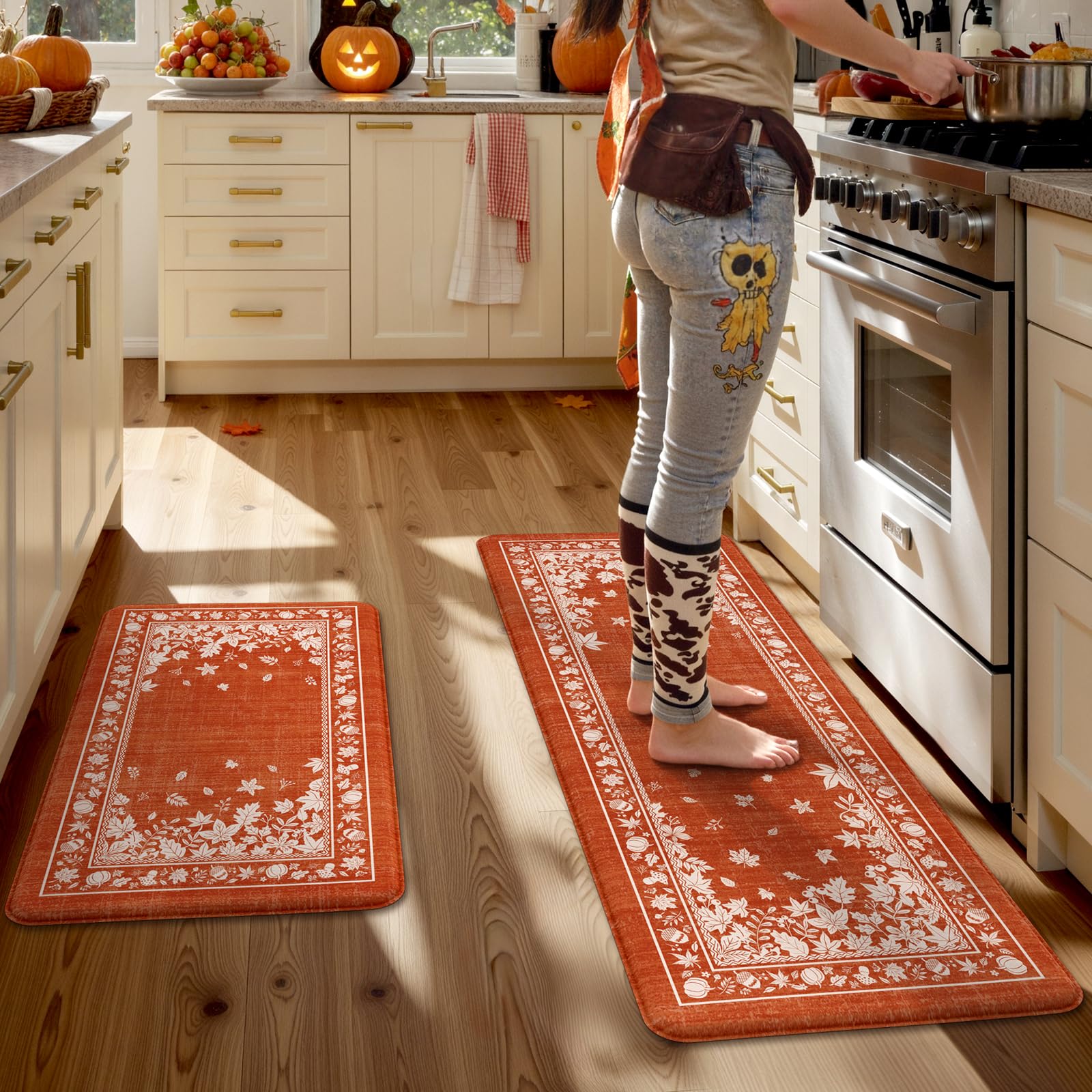 KIMODE Alfombrillas acolchadas de hoja de arce y calabaza, antideslizantes, color naranja, 17 x 47 pulgadas + 17 x 29 pulgadas