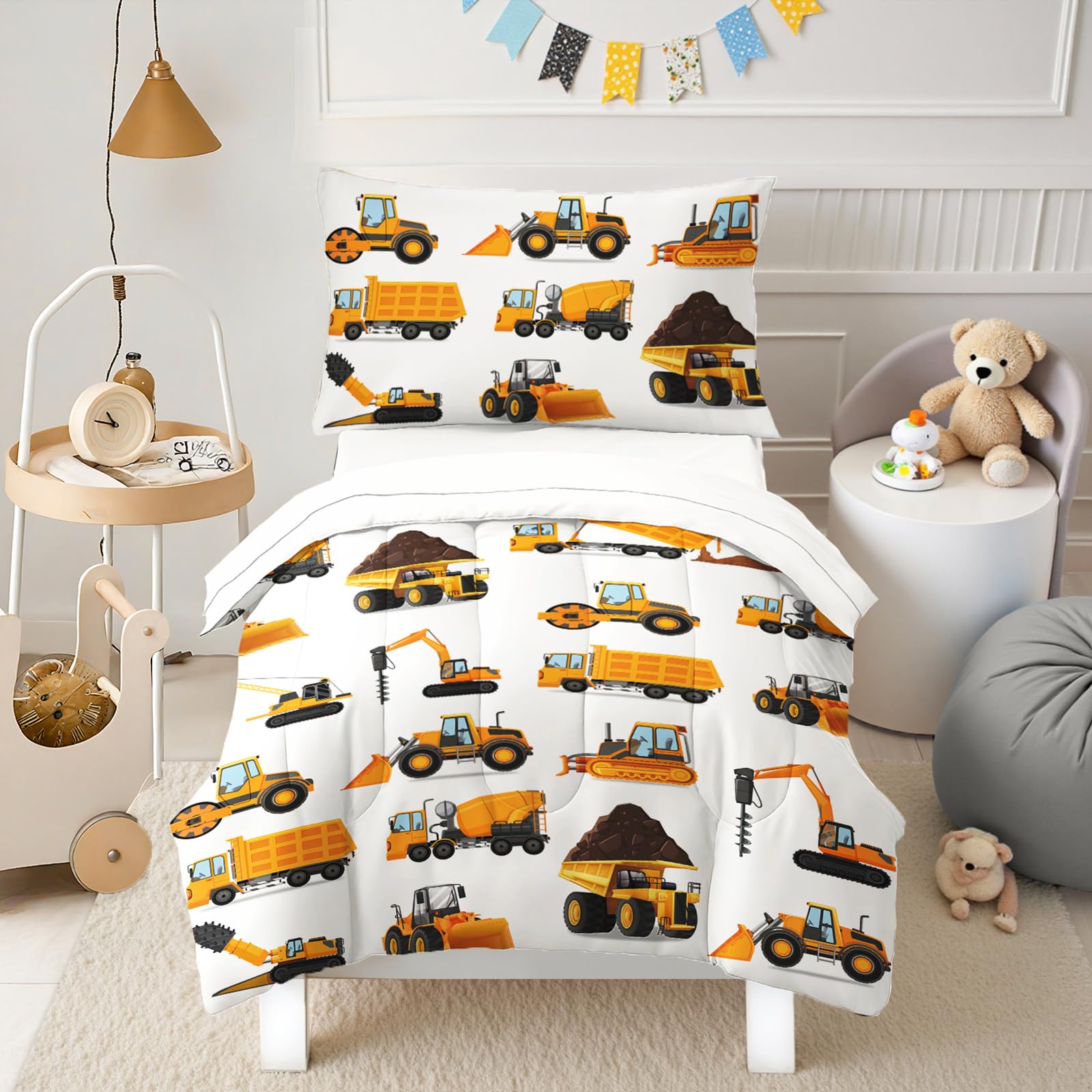 Juego de ropa de cama para niños pequeños – Juego de edredón de 4 piezas para niños, ropa de cama de vehículo de construcción suav