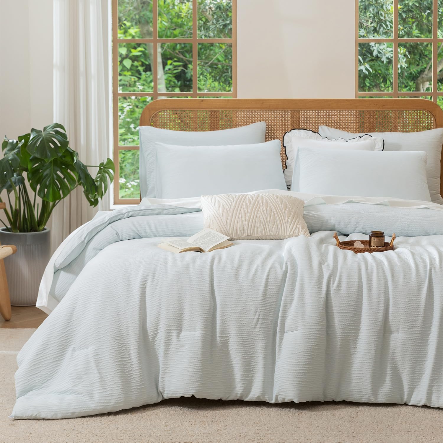 Juego de edredón de 3 piezas, color azul claro, de gasa arrugada ligera de doble capa, para todas las estaciones, ropa de cama sua