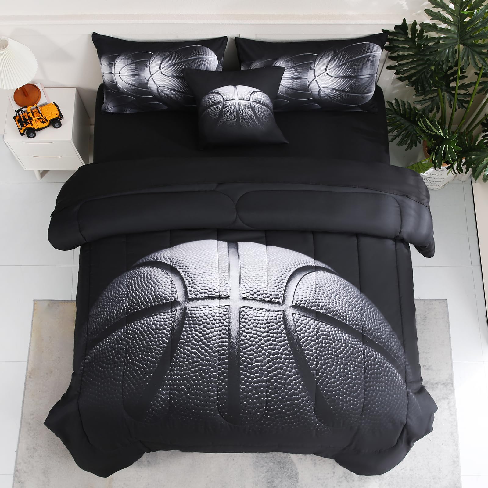Juego de ropa de cama matrimonial de 6 piezas de baloncesto para niños, deportes de baloncesto, negro, juego de edredón tamaño mat