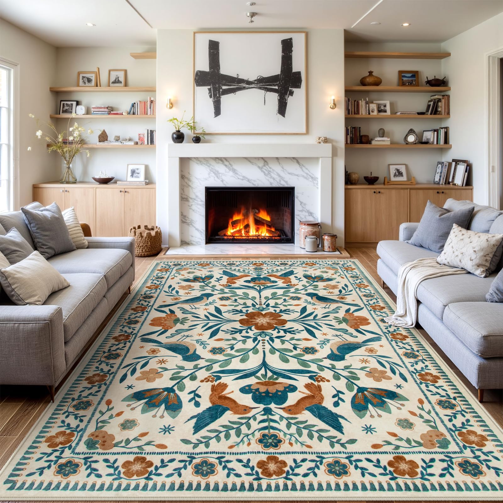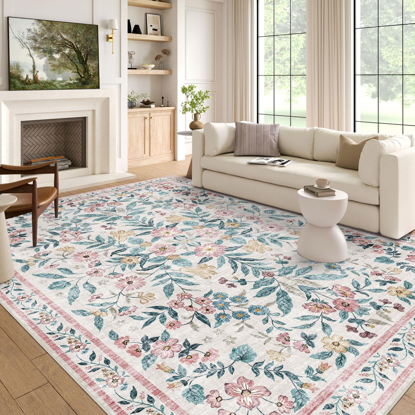 Alfombra lavable de 8 x 10 pies para sala de estar, alfombra floral para dormitorio, alfombra suave vintage antideslizante con par