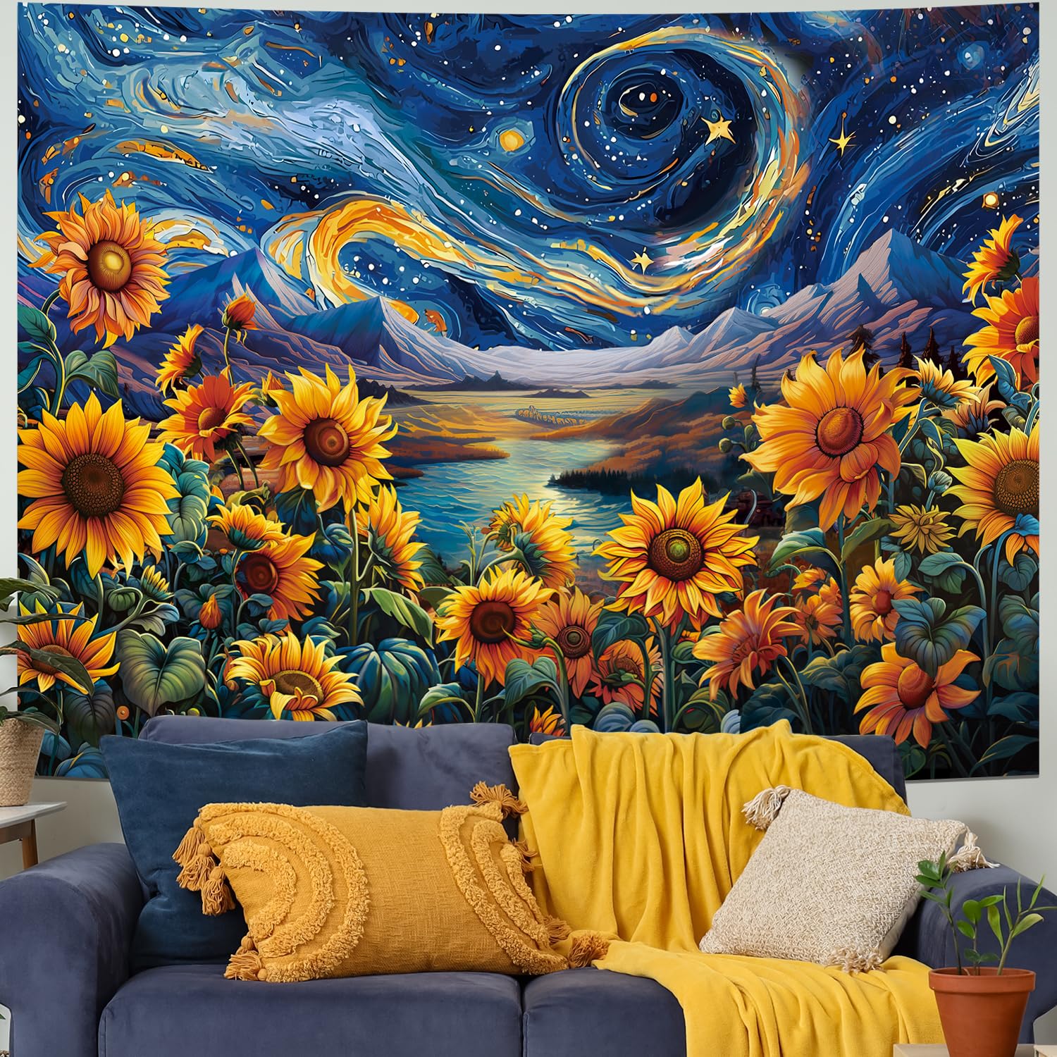 Yuiqear Tapiz de girasol, cielo estrellado, galaxia, espacio, misterioso, montaña, río, decoración de pared, tapiz de paisaje de f