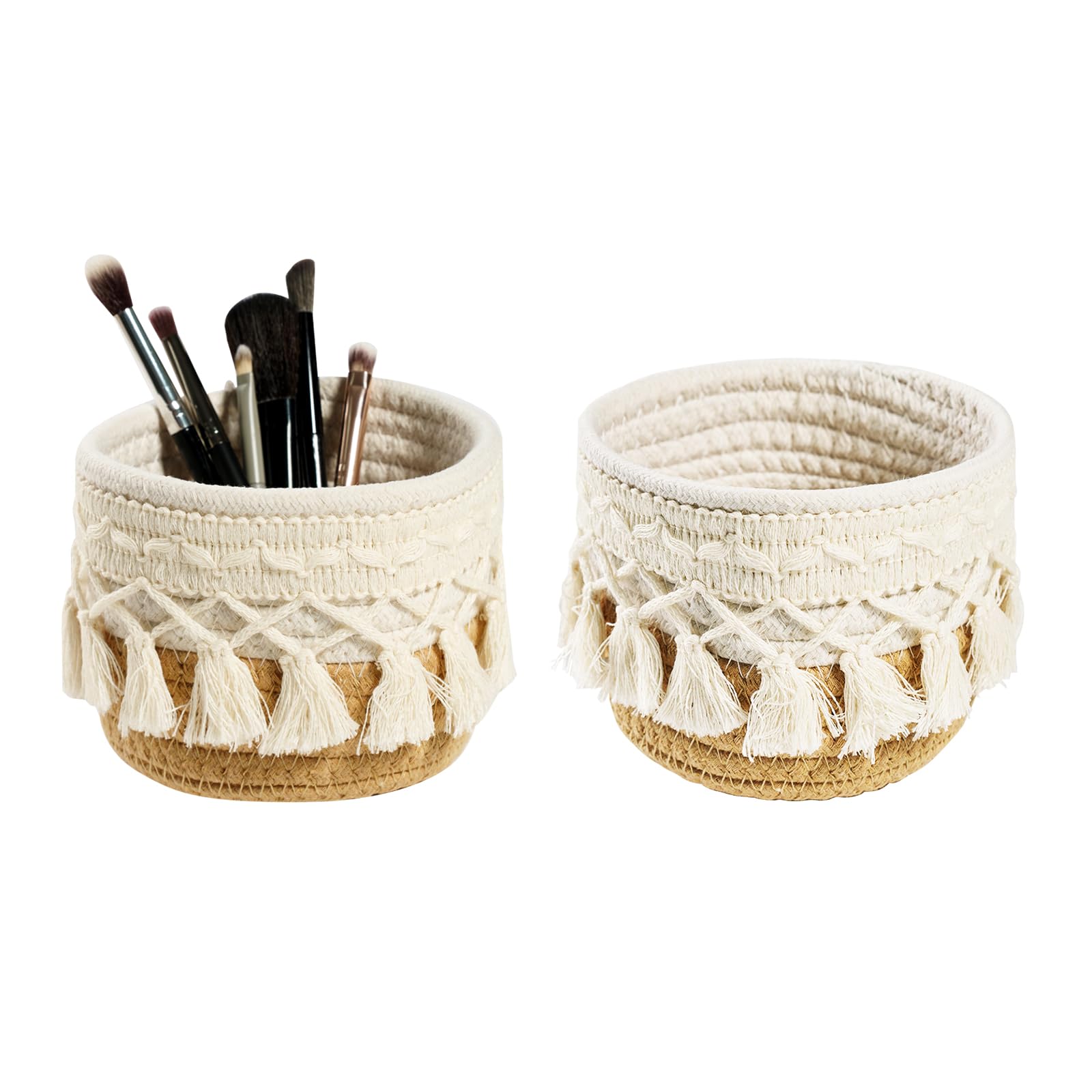 Macrame Makeup Brush Holder Organizer Mini Makeup Containers Boho Small Round Storage Basket 4.7”*3.9” Tassels Fringe Decorative