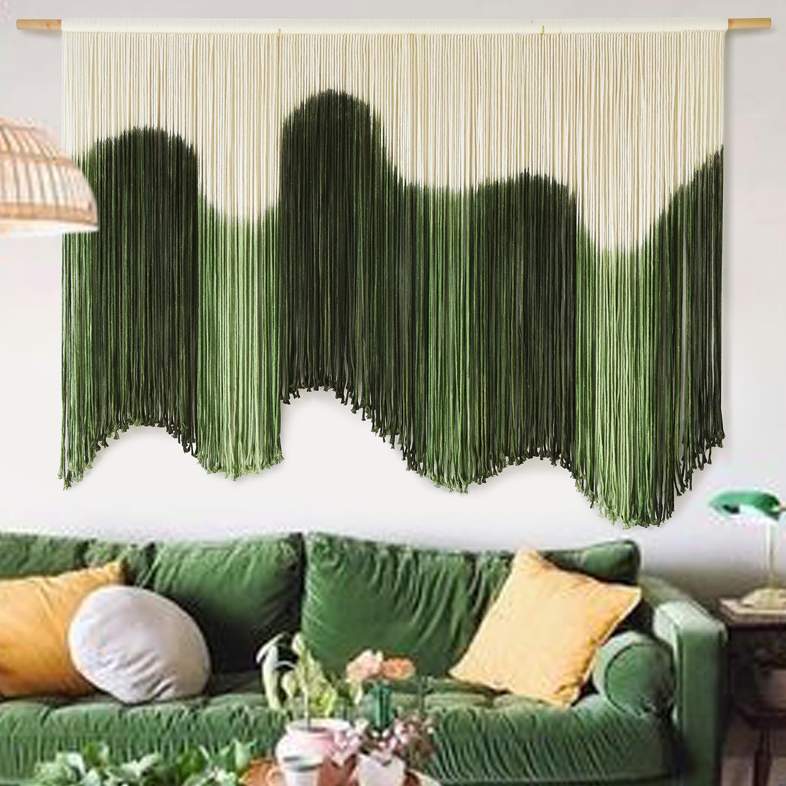 IOWER Macramé grande para colgar en la pared, arte bohemio de pared de fibra verde, teñido por inmersión y cuerda de macramé hecha