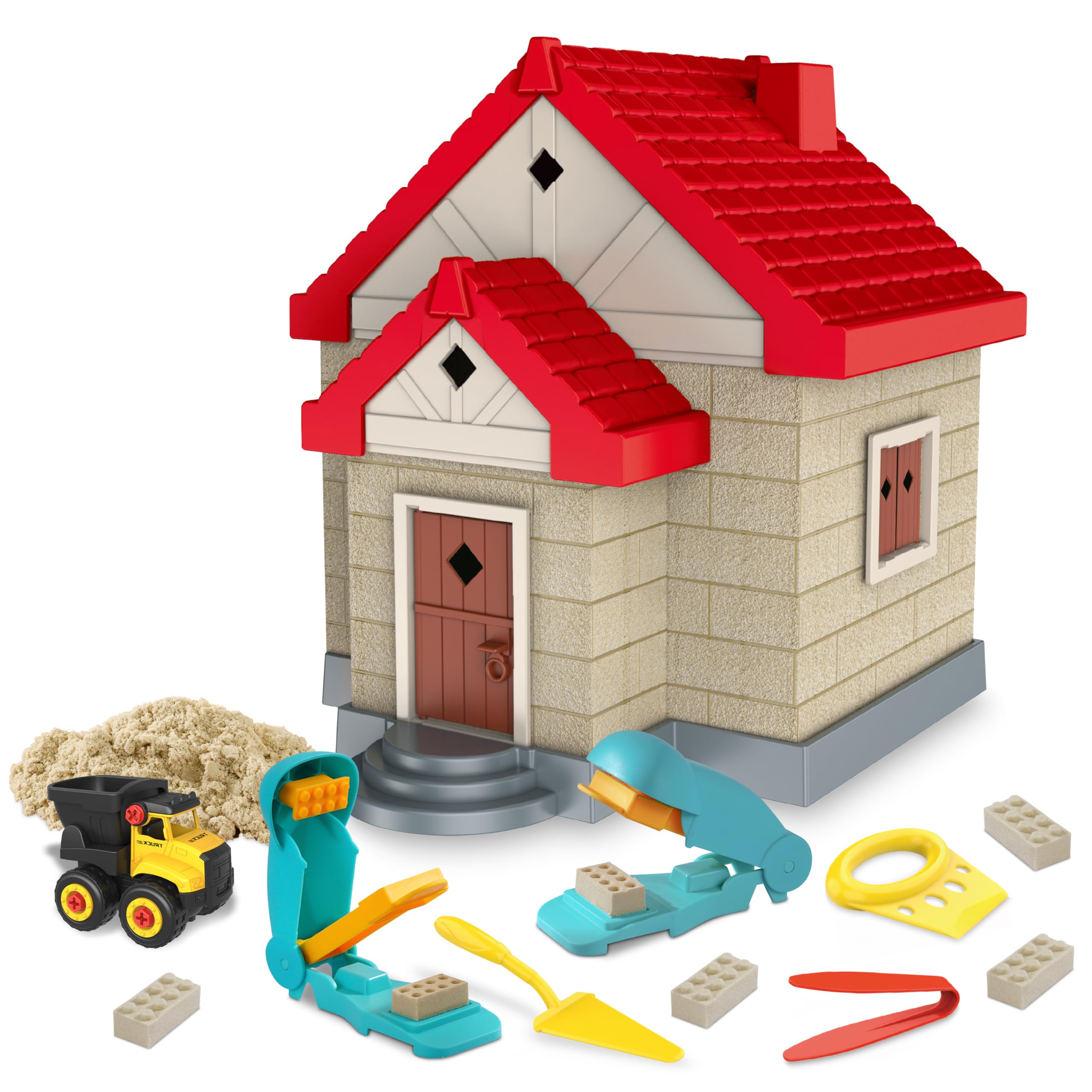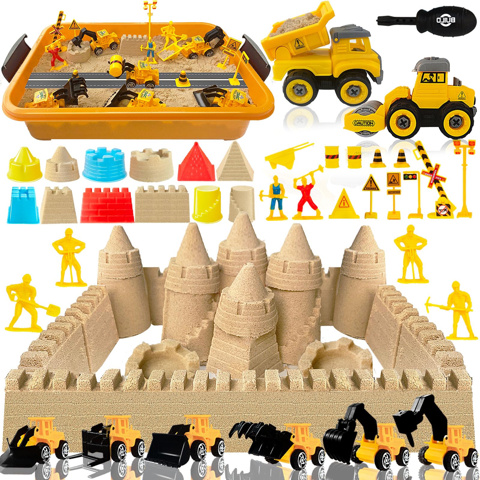 Kit de construcción de arena mágica – 3 libras de arena, 5 vehículos, 11 moldes, 8 herramientas, 7 señales, 4 trabajadores, juguet