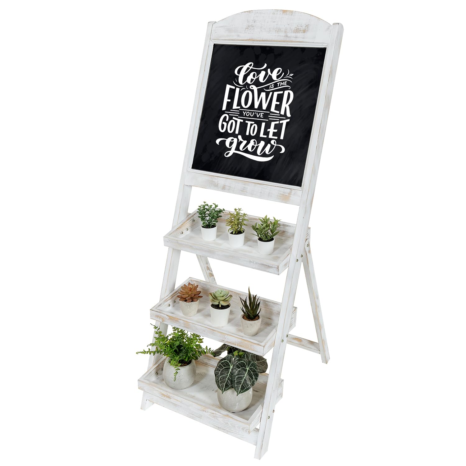 MyGift Caballete de pizarra independiente de madera encalada con estantes de exhibición de 3 niveles, soporte decorativo para plan