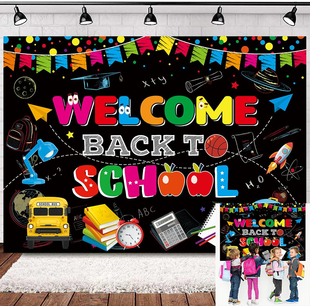 Cartel de bienvenida de vuelta a la escuela, telón de fondo para el primer día de escuela, decoración de pizarra negra con texto e