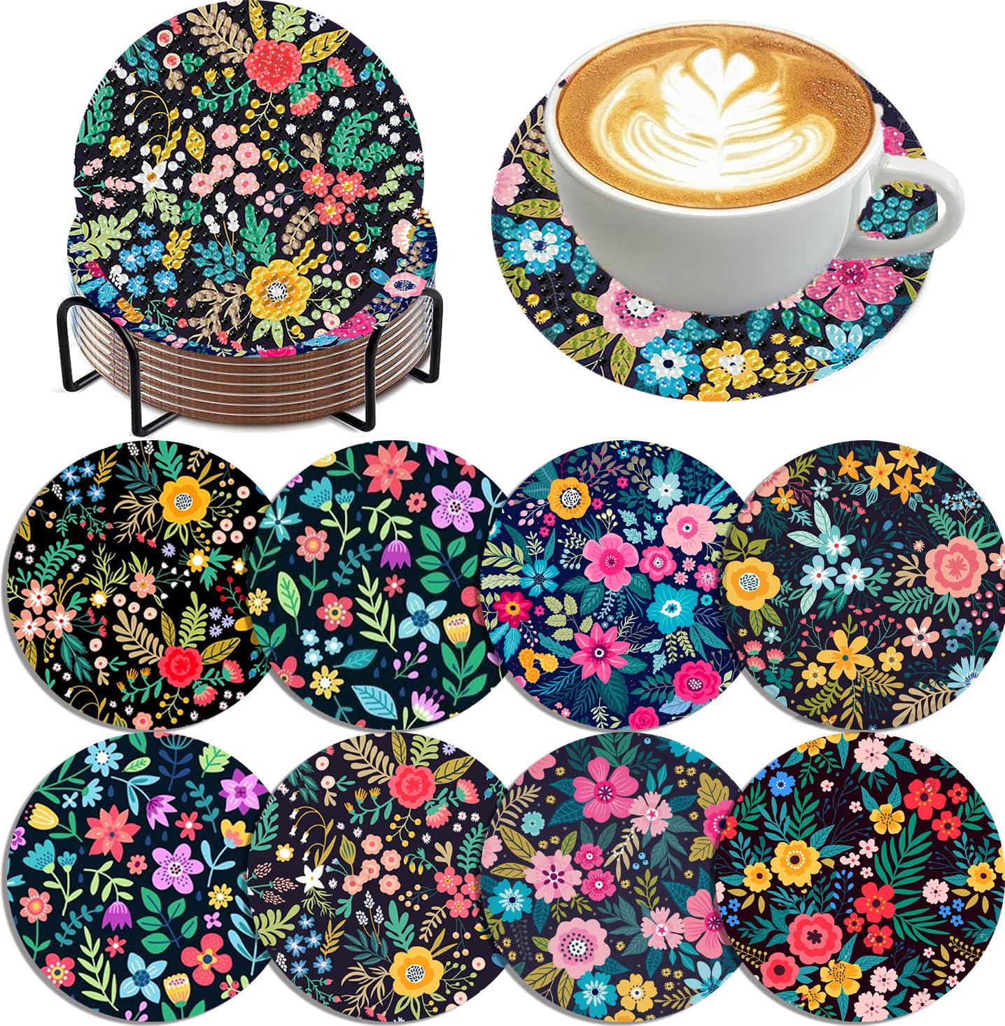 Juego de 8 posavasos con diseño de diamantes, juego de posavasos de pintura de diamantes con soporte, almohadillas de corcho, bebi
