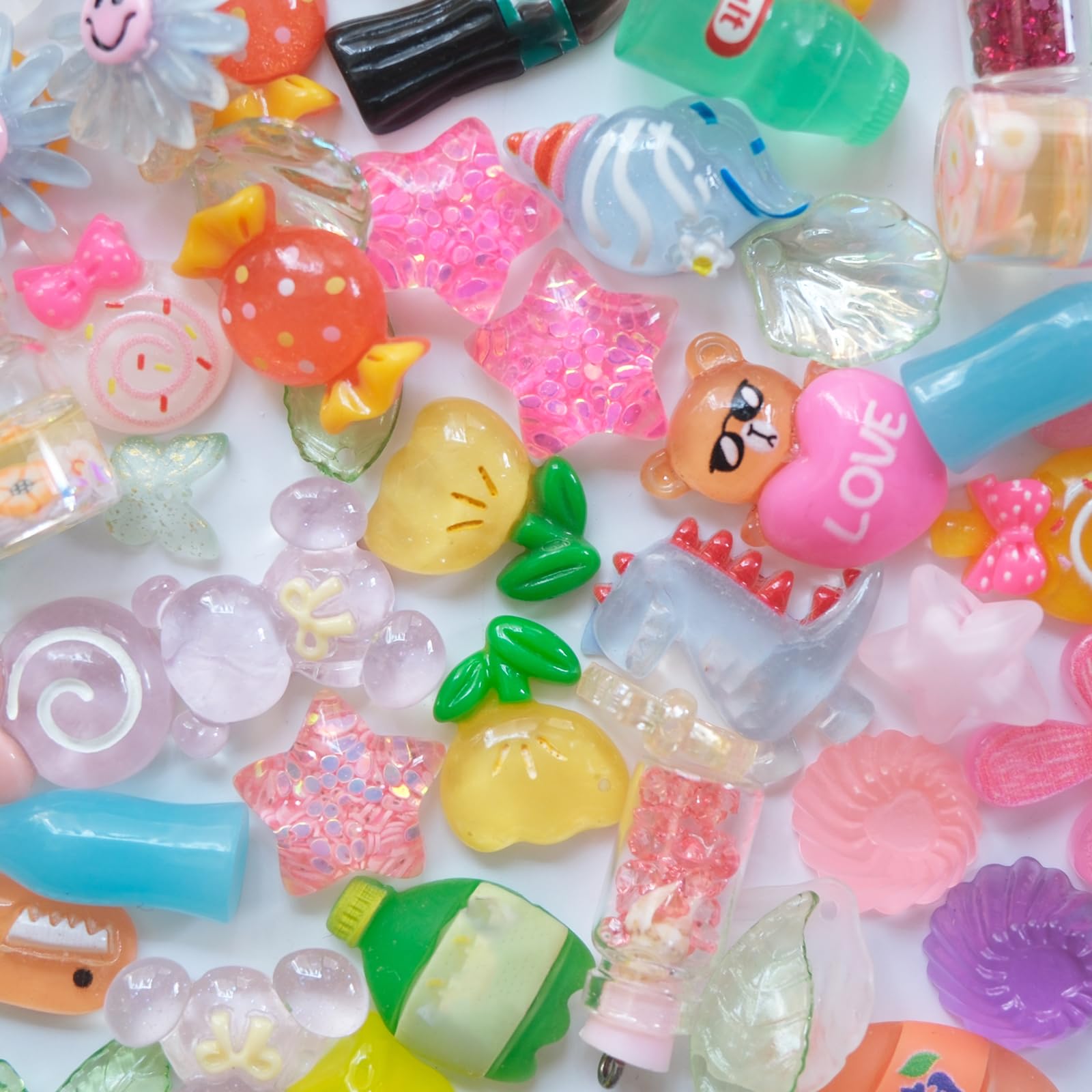 Juego de 100 dijes de slime a granel, multicolor, de resina kawaii, parte trasera plana, brillante, divertido, juego de baratijas,