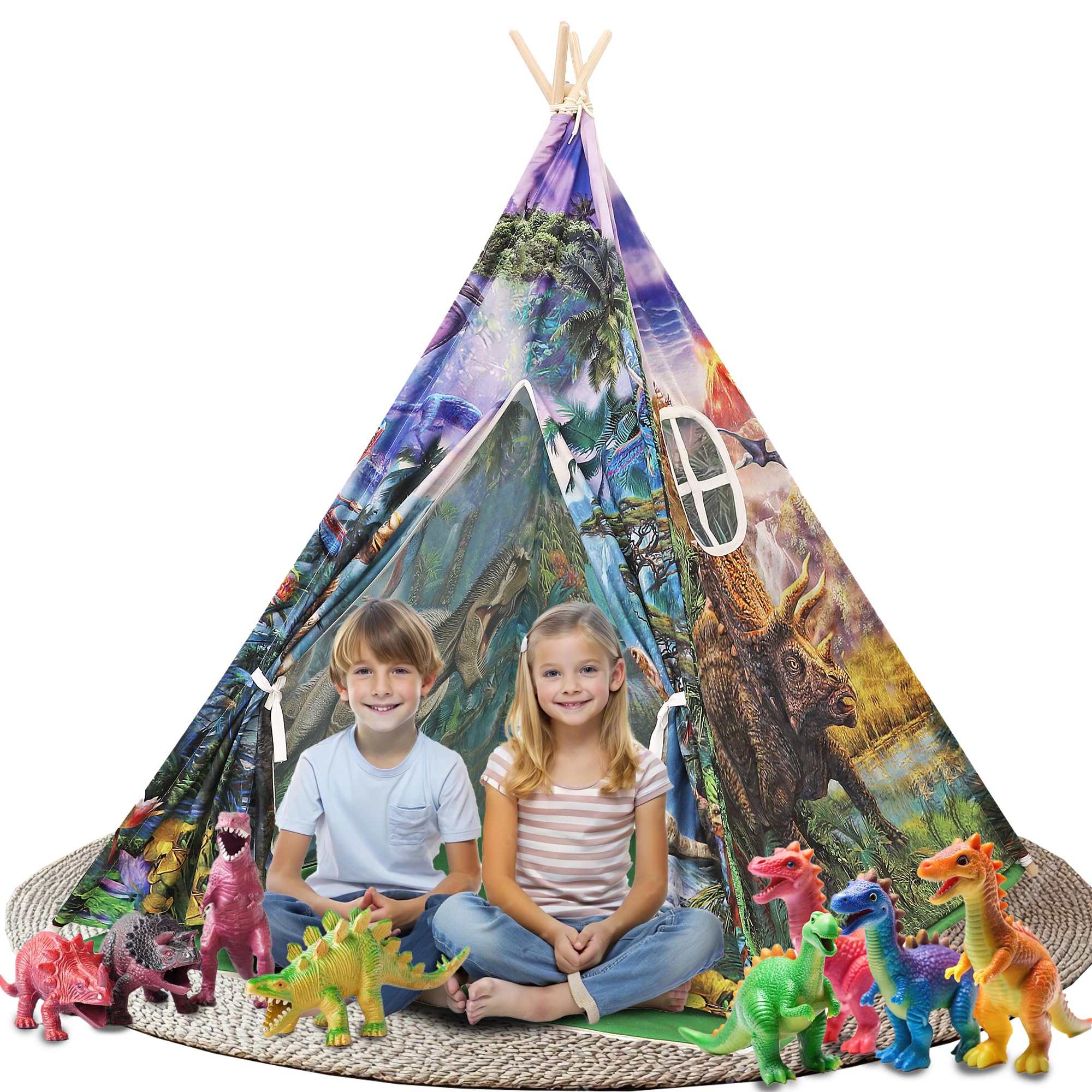 LimitlessFunN Tienda de campaña para niños con diseño de tipi de dinosaurio, incluye alfombrilla acolchada, postes de madera, luce