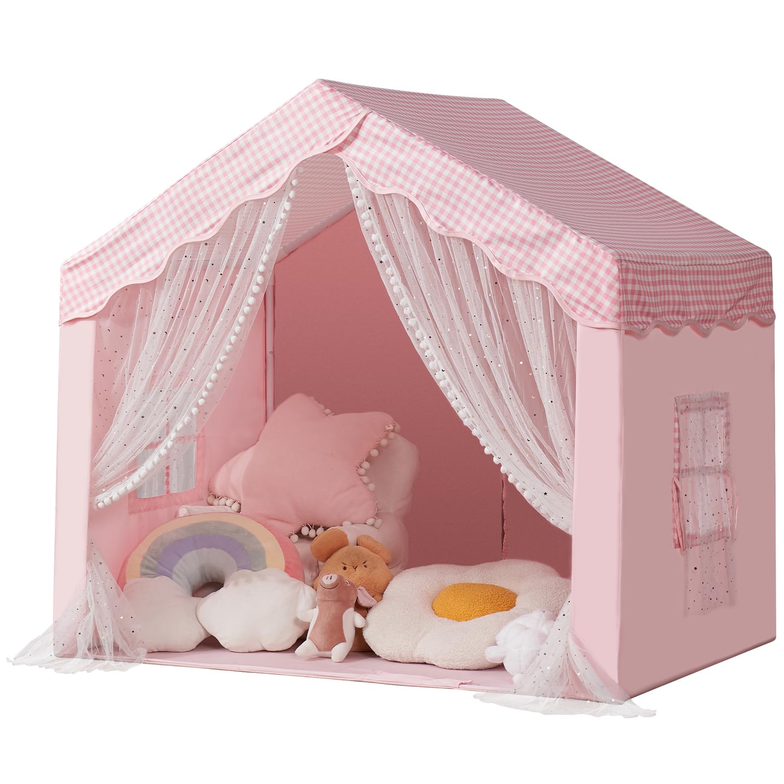 Tienda de campaña para niños, casa de juegos de lona de algodón con patrón de cuadros, marco de PVC (rosa)