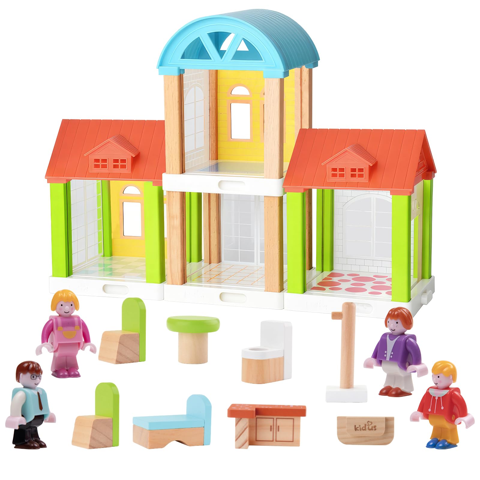 Juego de casa de muñecas de madera pequeña de 42 piezas, casa de juguetes familiares para 4 habitaciones con 4 muñecas móviles, ac