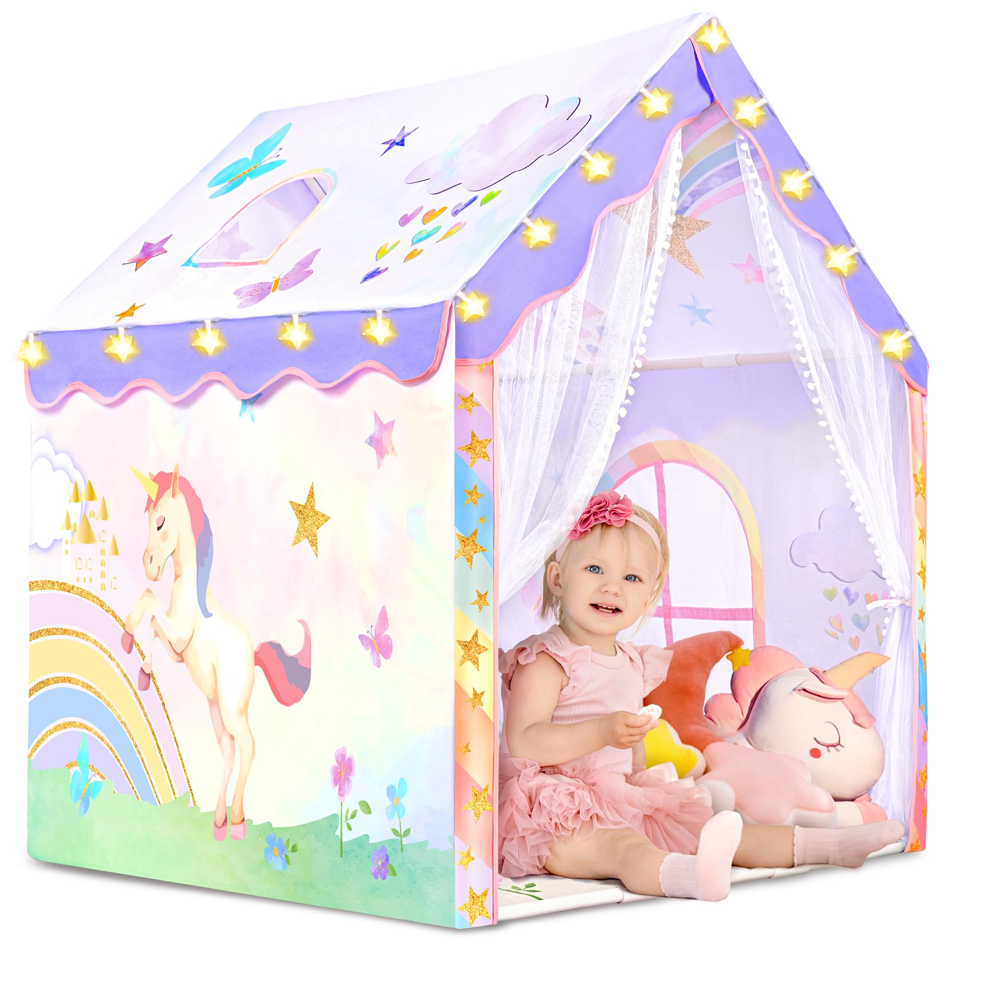 SULIFEEL Tienda de campaña de unicornio para niños con alfombrilla y luces LED de estrella, tienda de campaña para niñas para jueg