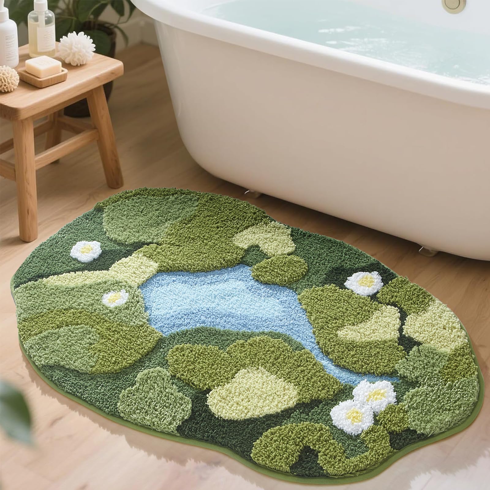 HIGHSEASON Cute Moss Bath Mat,3D Green Floral Area Bathroom Rug,Non Slip Water Absorbent Bath Mat Tufted Rug for Shower Floor, Sin