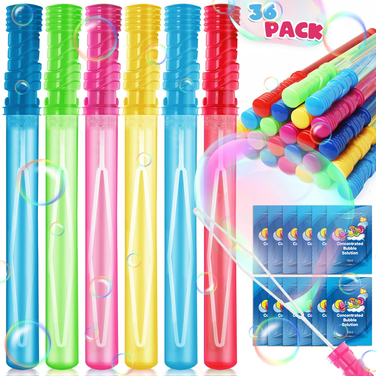 Paquete de 36 varitas de burbujas de 15 pulgadas en 6 colores, varitas de burbujas grandes con 36 soluciones de recarga de burbuja