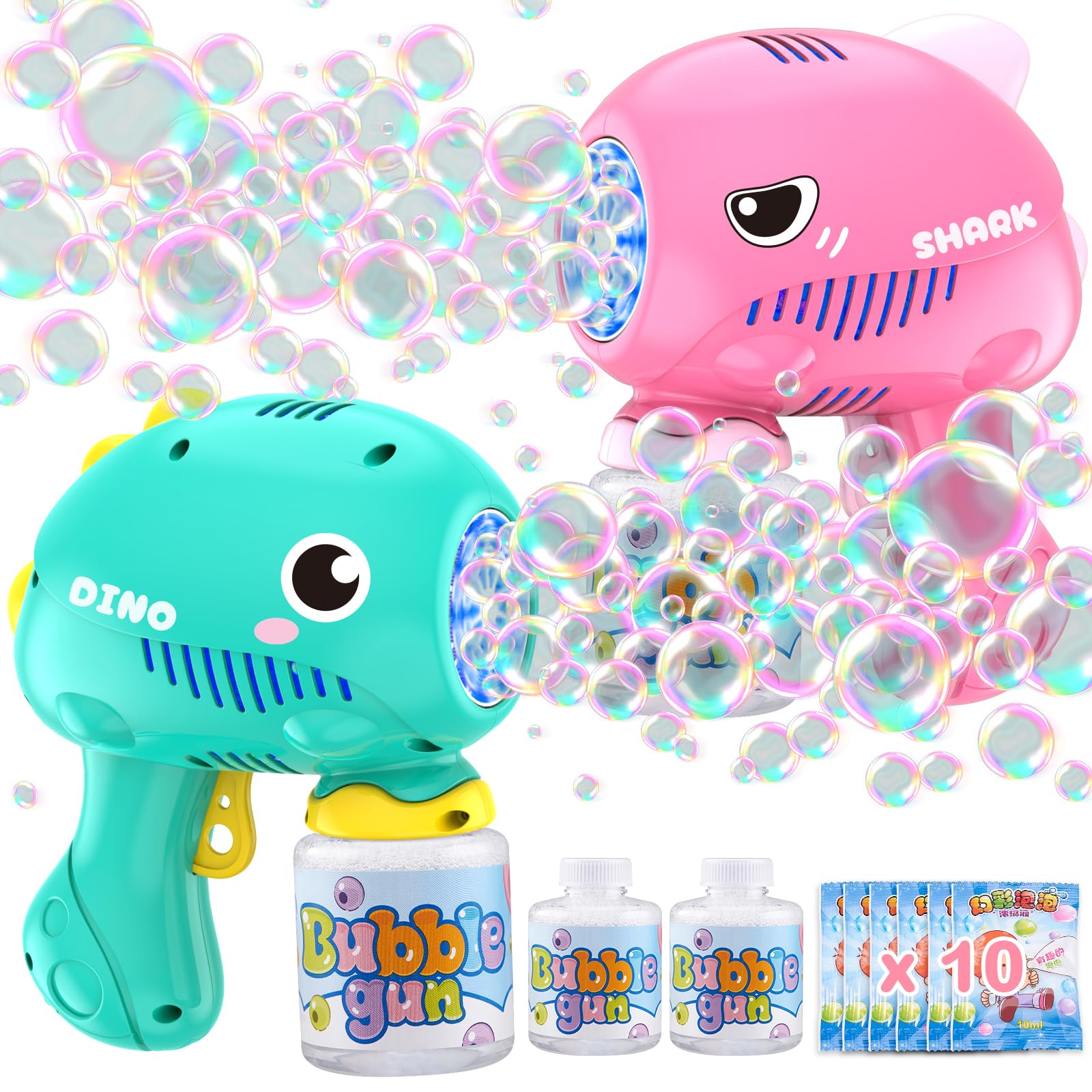 Paquete de 2 pistolas de burbujas para niños, soplador automático de burbujas con 4 botellas, solución de recarga de 10 bolsas, pi