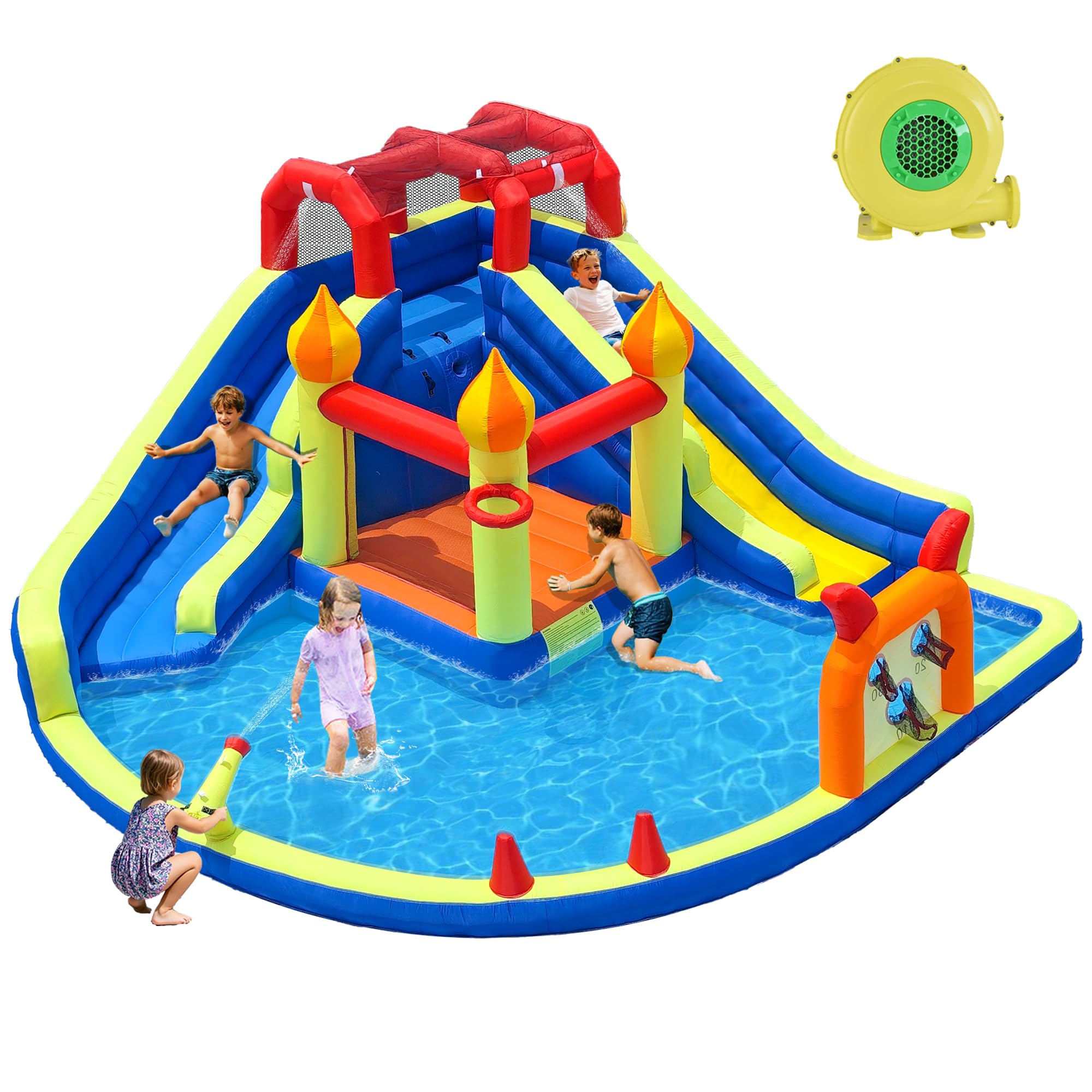 Tobogán acuático inflable, parque acuático 10 en 1 con soplador, piscina de salpicaduras, 2 toboganes, cañón de agua, pared de esc