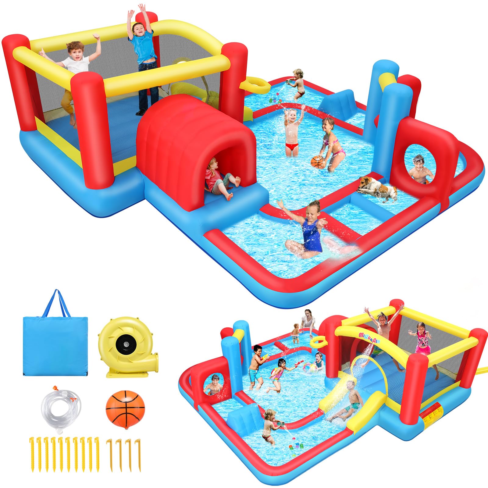 Bounce House – Tobogán acuático para niños de 3 a 12 años con soplador, carrera de obstáculos inflable de 14.3 x 14.3 pies con áre