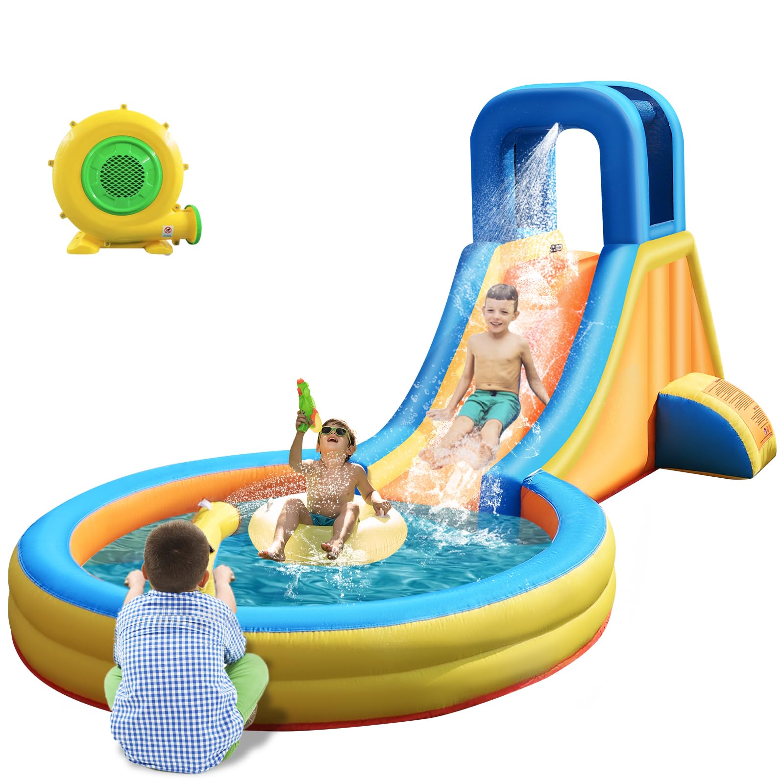 Tobogán acuático inflable para niños – Casa inflable 5 en 1 con tobogán largo, pared de escalada, piscina de chapoteo, cañón de ag