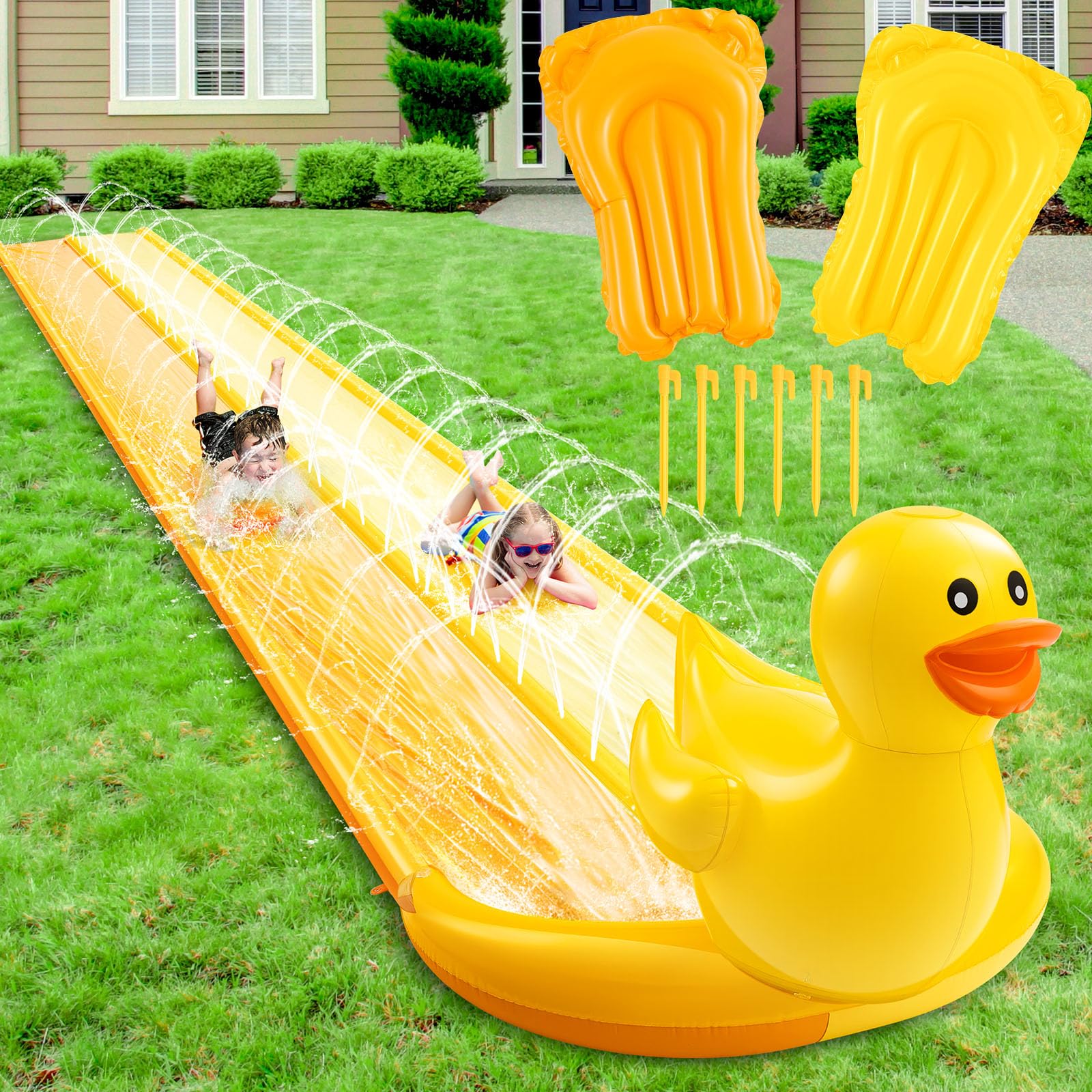 Tobogán acuático deslizante de 30 pies con 2 tablas de bodyboard, doble carril resistente para juegos de patio trasero con rociado