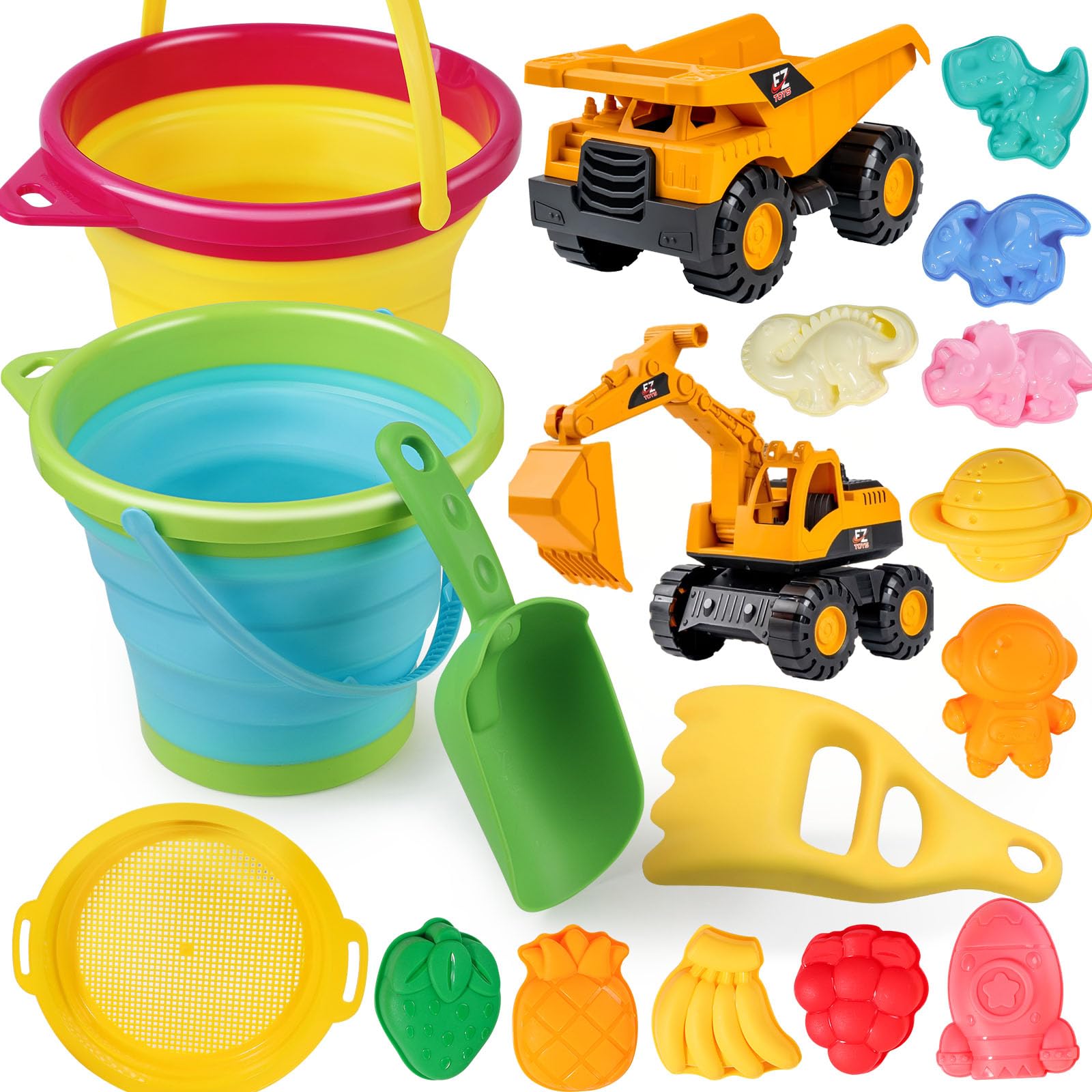 Juguetes de playa, juguetes de arena con vehículos de construcción 2 en 1, cubo de playa plegable, kit de construcción de castillo