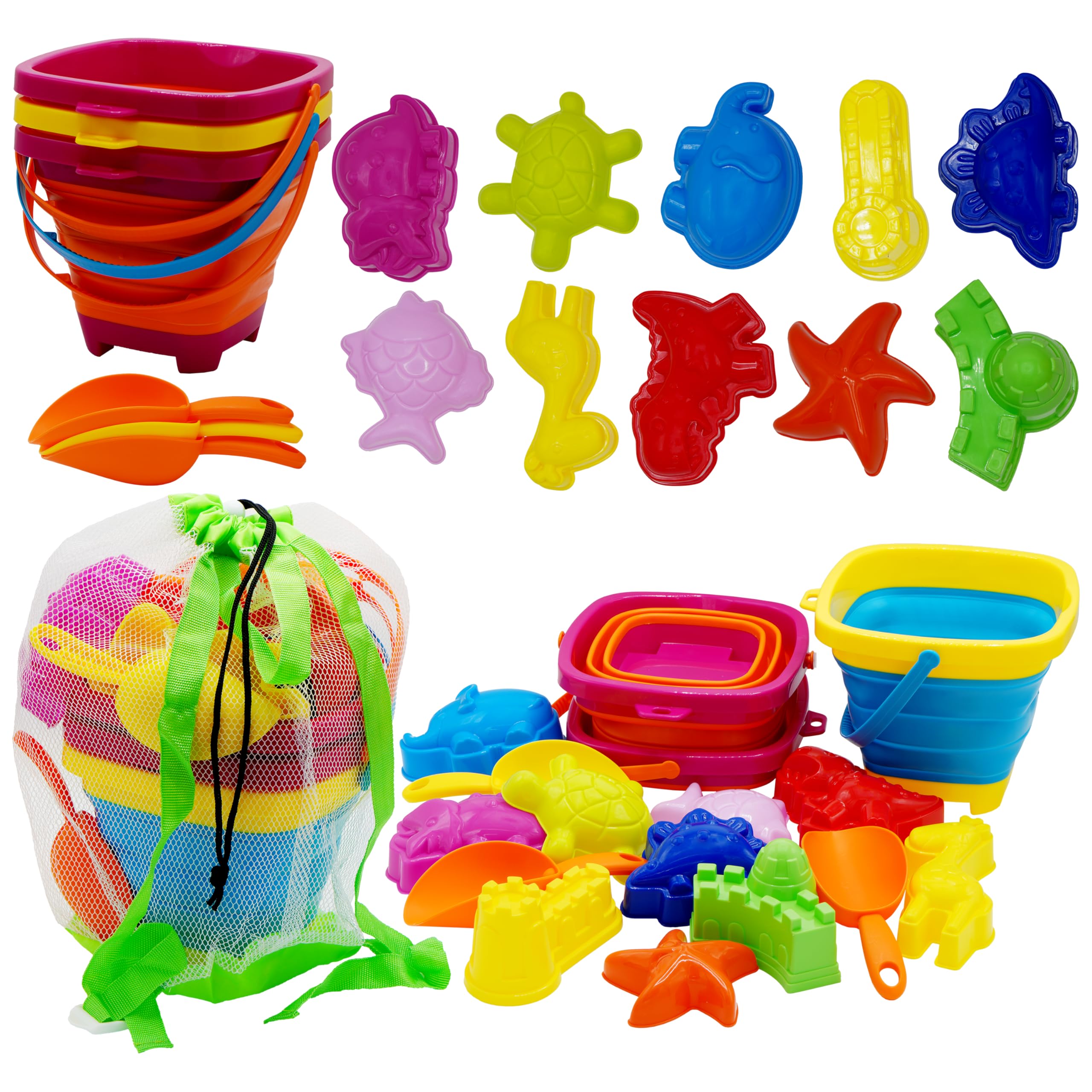 Juguetes de playa plegables para niños, 2 cubos plegables, bolsas de malla, moldes de arena de animales, juego de pala para niños
