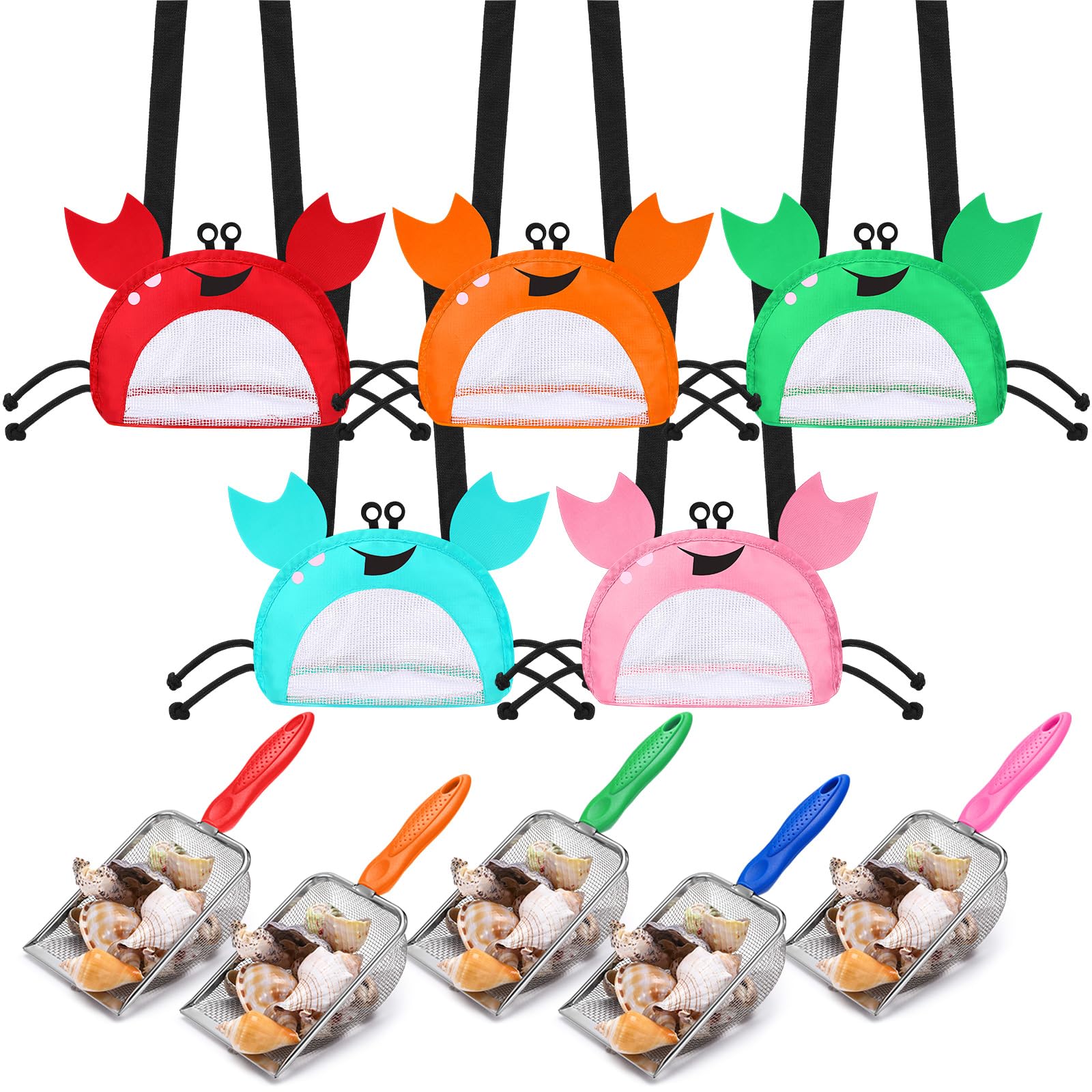 10 bolsas de malla de playa y conchas, tamiz de dientes de tiburón, cangrejo, bolsas de arena para recolección de conchas, filtro