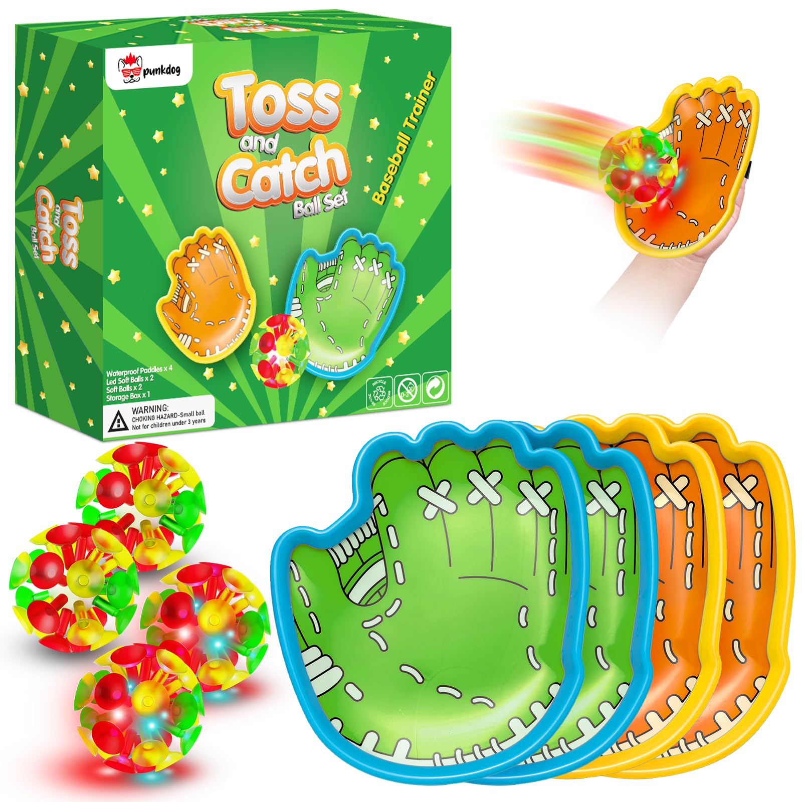 Juego de pelota LED para lanzar y atrapar – 2 LED y 2 bolas de ventosa regulares con 4 guantes de fácil agarre – Juguetes deportiv