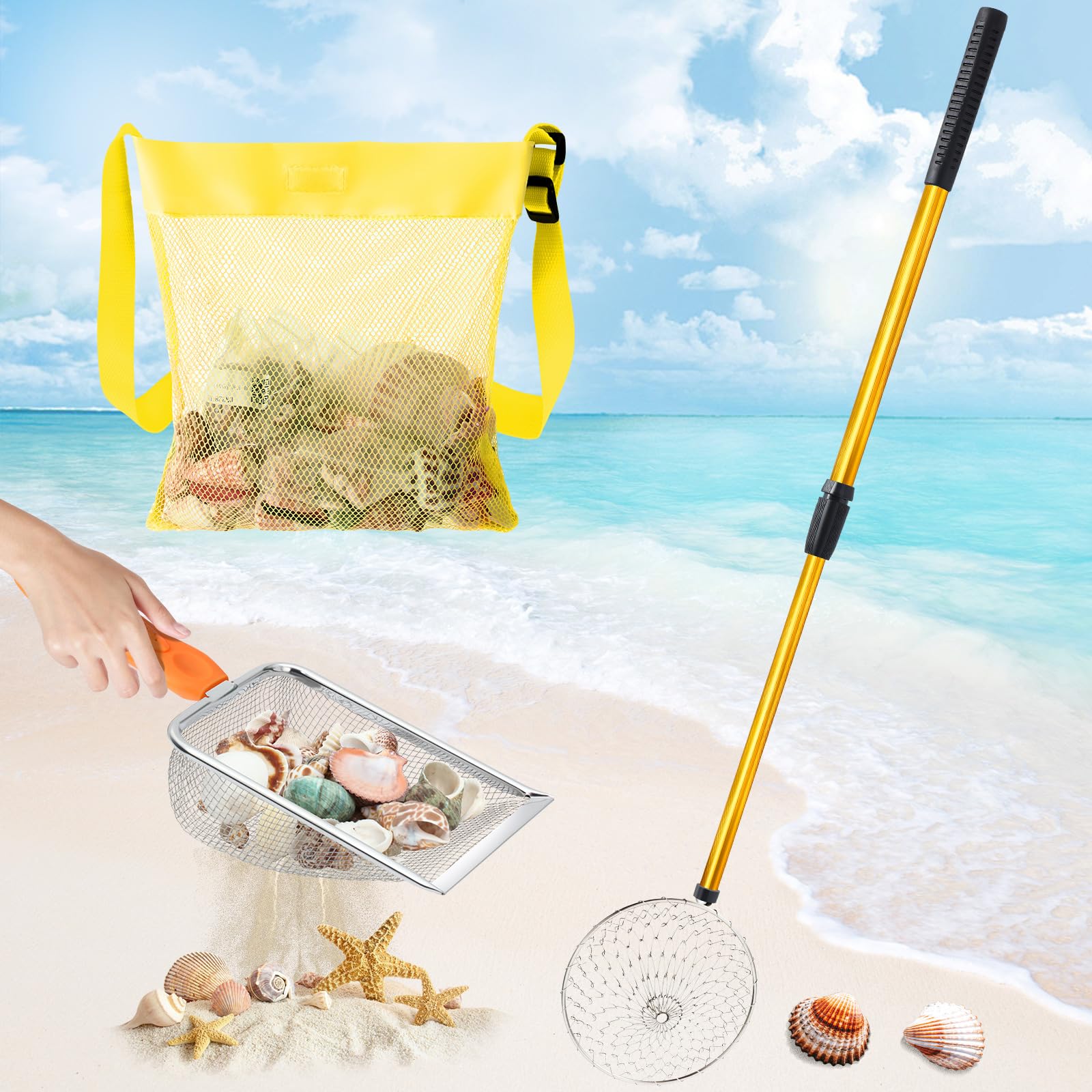 Liliful 3 herramientas de pelado para playa, tamiz de arena de playa de 28 pulgadas con mango largo, pala de malla de playa, pala