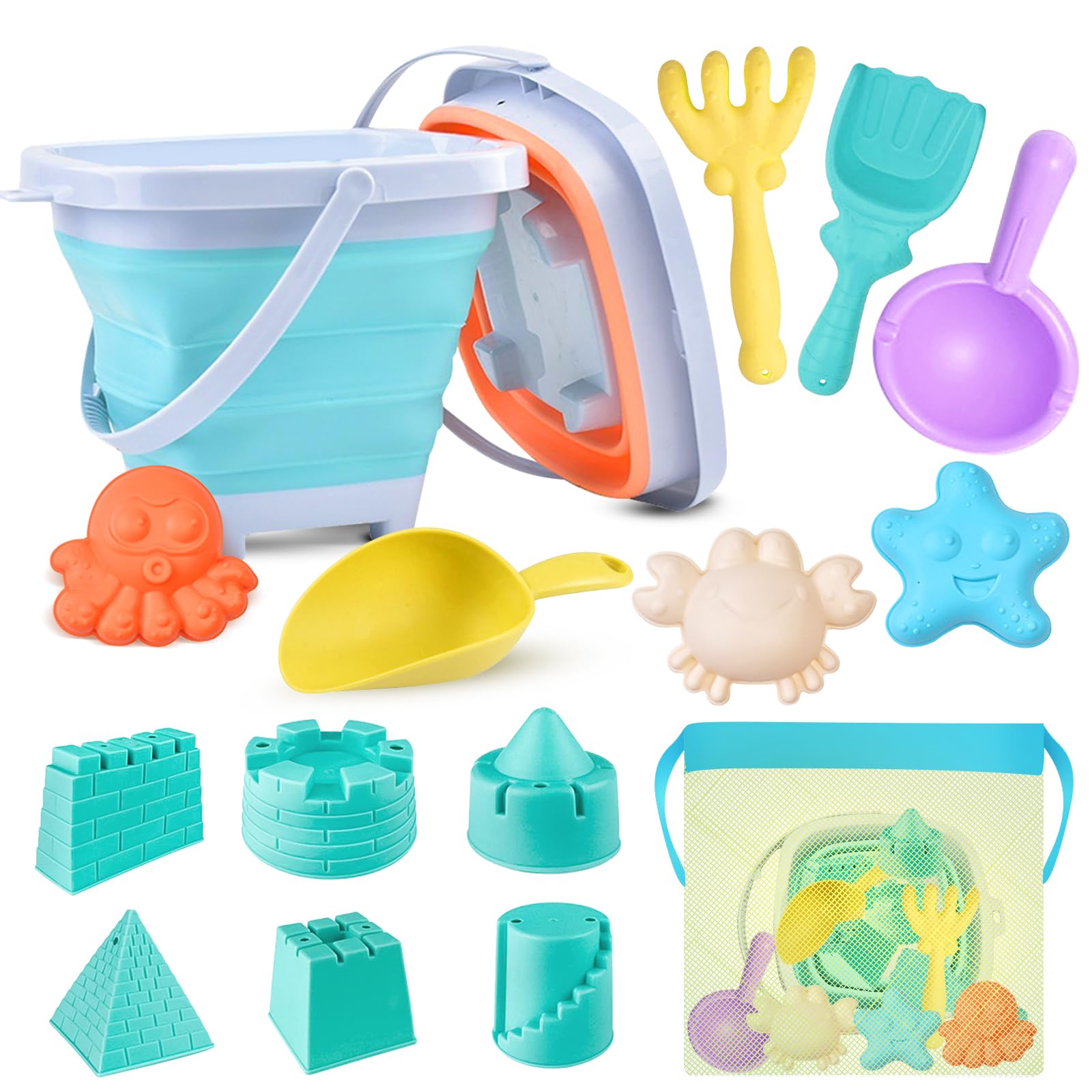 Juguetes de playa, 16 juguetes de arena, juguetes de caja de arena con moldes de castillo y animales marinos, palas de arena, bols