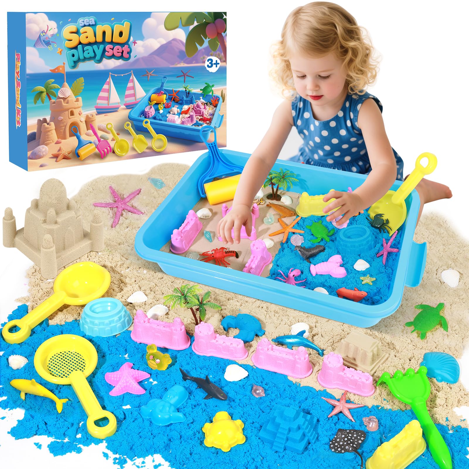 Cubo sensorial oceánico, kit de arte de arena con arena de juego de 3.3 libras, moldes de juguetes de animales marinos, juego sens