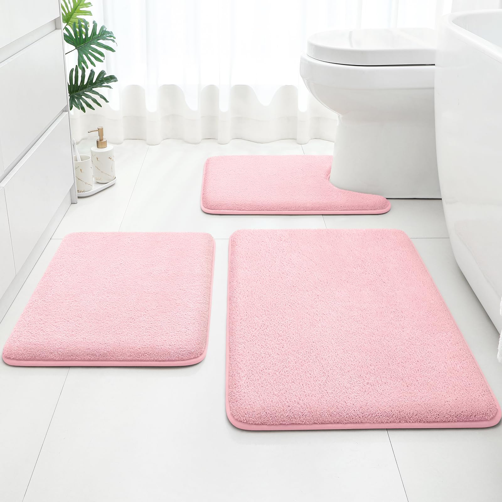 HOMEIDEAS Upgraded Bathroom Rugs Set 3 Piece, Extra Thick Absorbent Soft Memory Foam, Washable Toilet Bath Mat (Light Pink,17″x24″