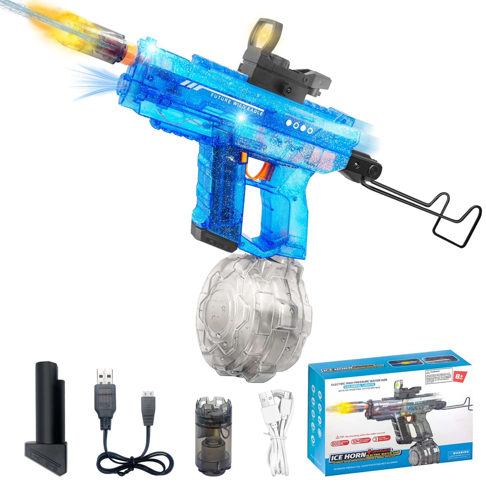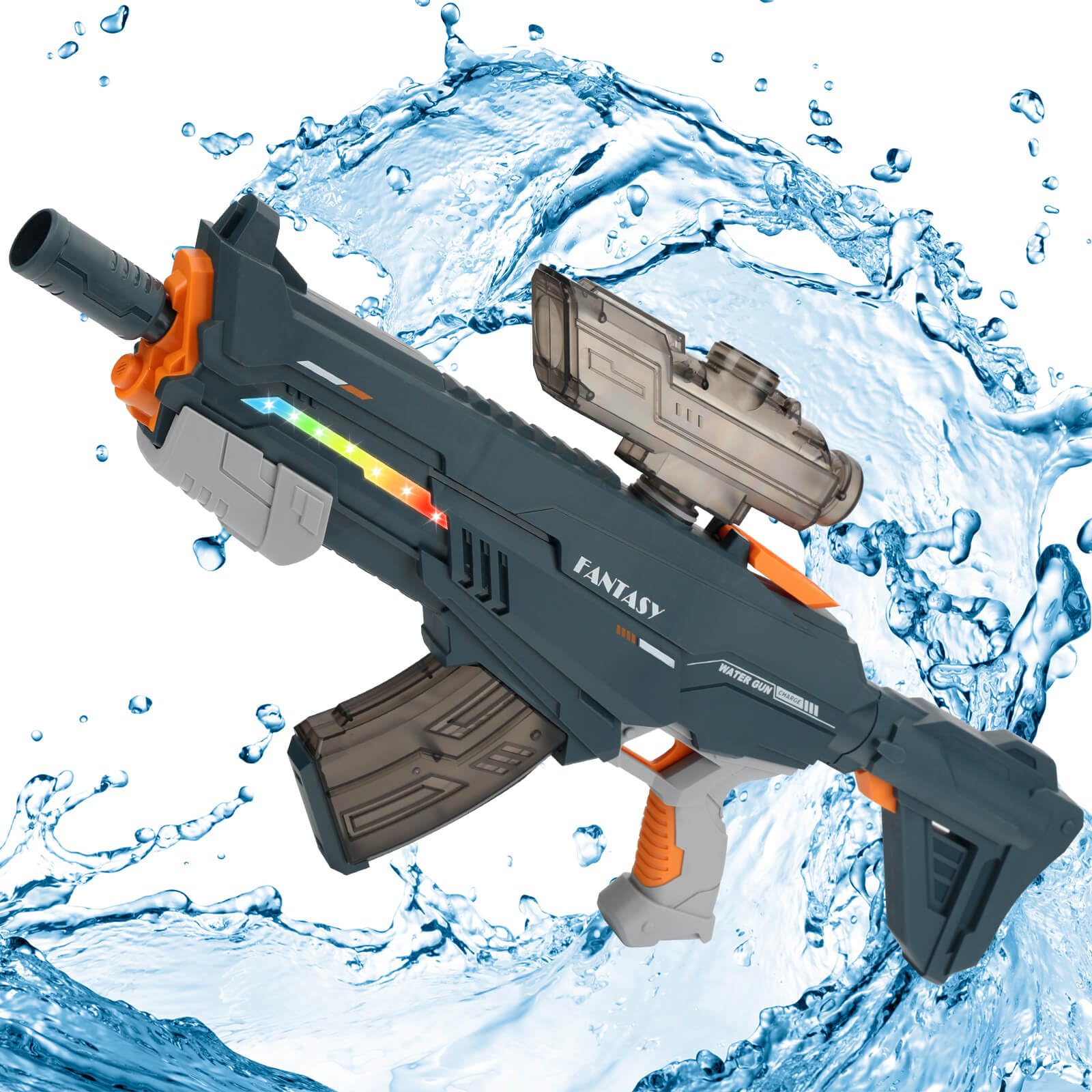 Pistola de agua eléctrica con efectos de luz LED, pistola de juguete de gran capacidad de 800 cc, alcance de 32 pies, sistema de s