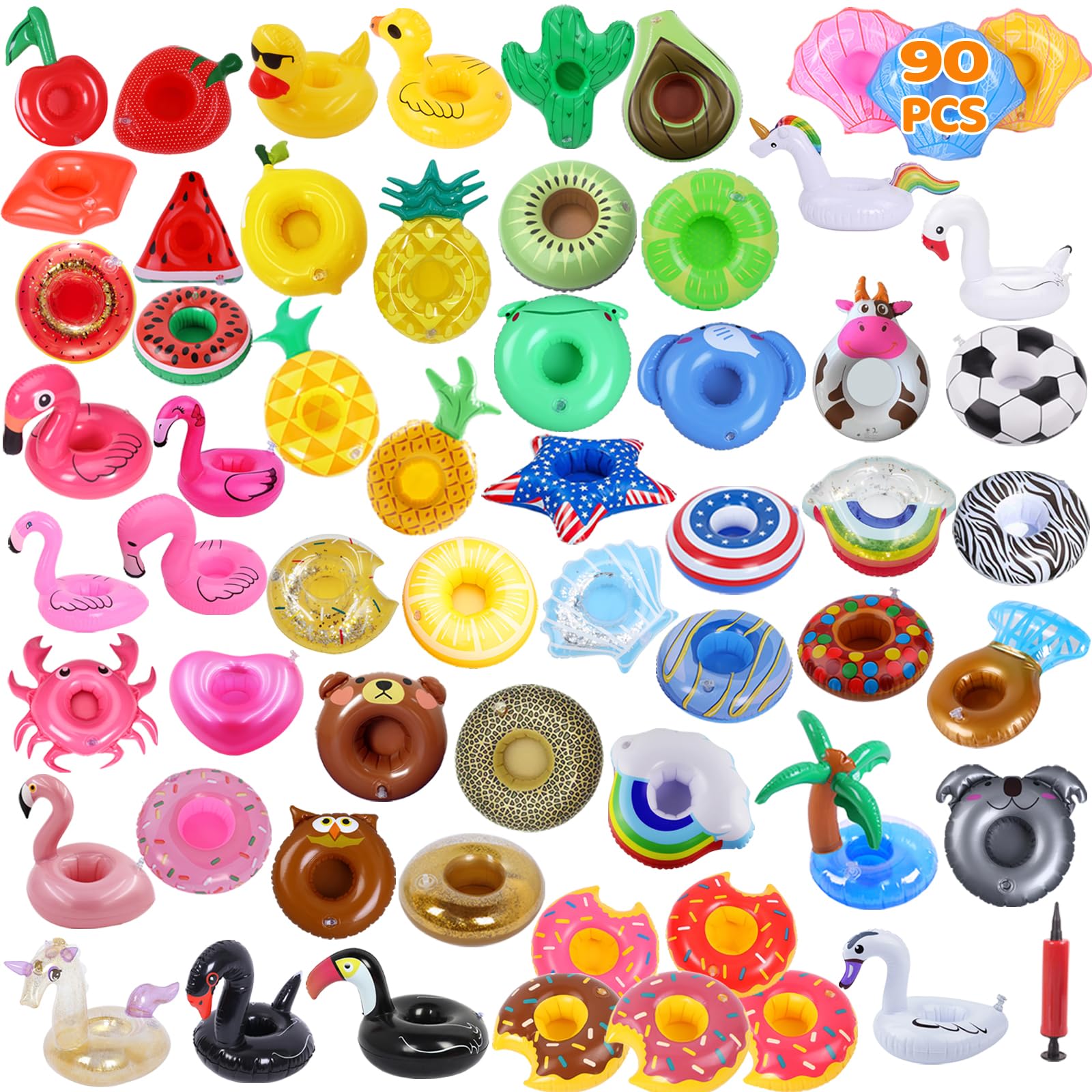 LanMa Soporte inflable para bebidas, paquete de 90 flotadores inflables para bebidas para piscina, variedad de flotadores de bebid