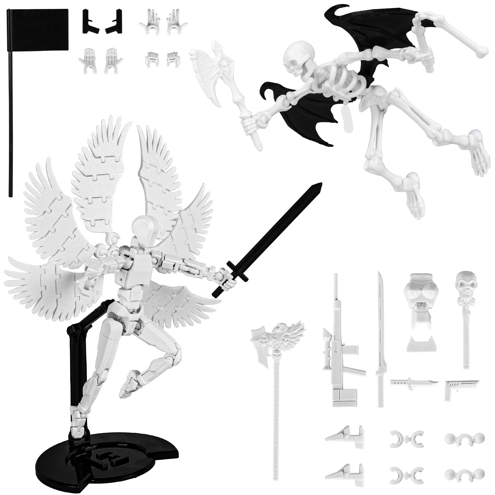 Juego de 2 figuras de acción blancas T13 (ensamblaje completado), figura articulada T13 impresa en 3D, muñeca de ángel y esqueleto