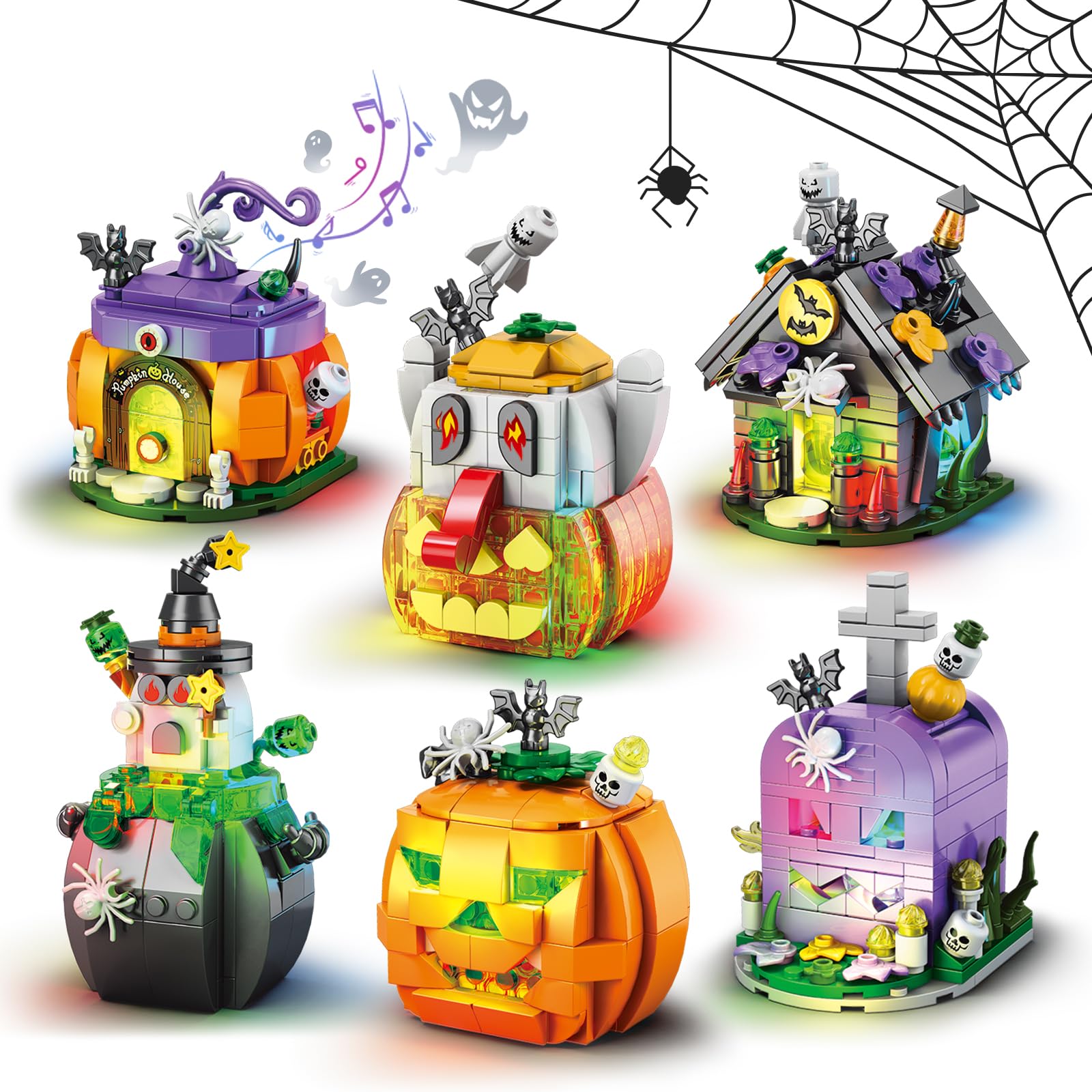 Juego de bloques de construcción de Halloween, casa embrujada, carruaje de calabaza, cabeza de cráneo, 6 modelos compatibles con L