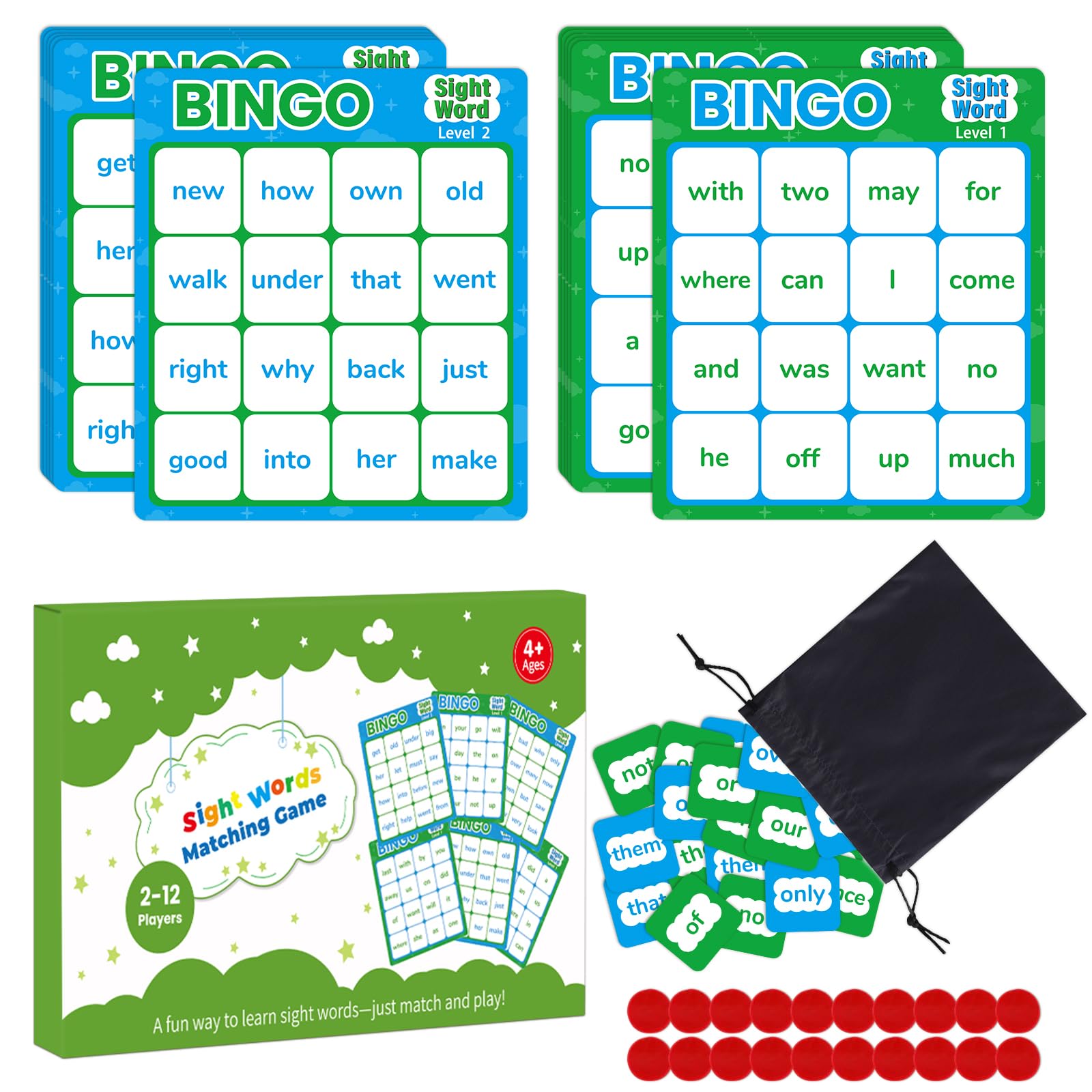 Sight Word – Juego de bingo para aprender a leer vocabulario, juego de mesa de bingo de nivel 1 y nivel 2 para jardín de infantes,