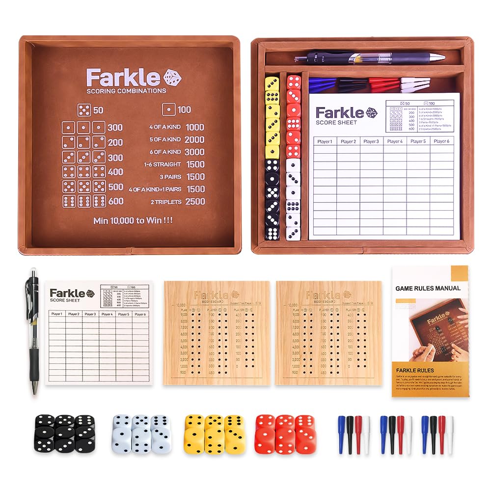 Farkle – Bandeja de dados y estuche de almacenamiento, incluye combinaciones de puntuación integradas, 4 juegos de 6 dados de perl