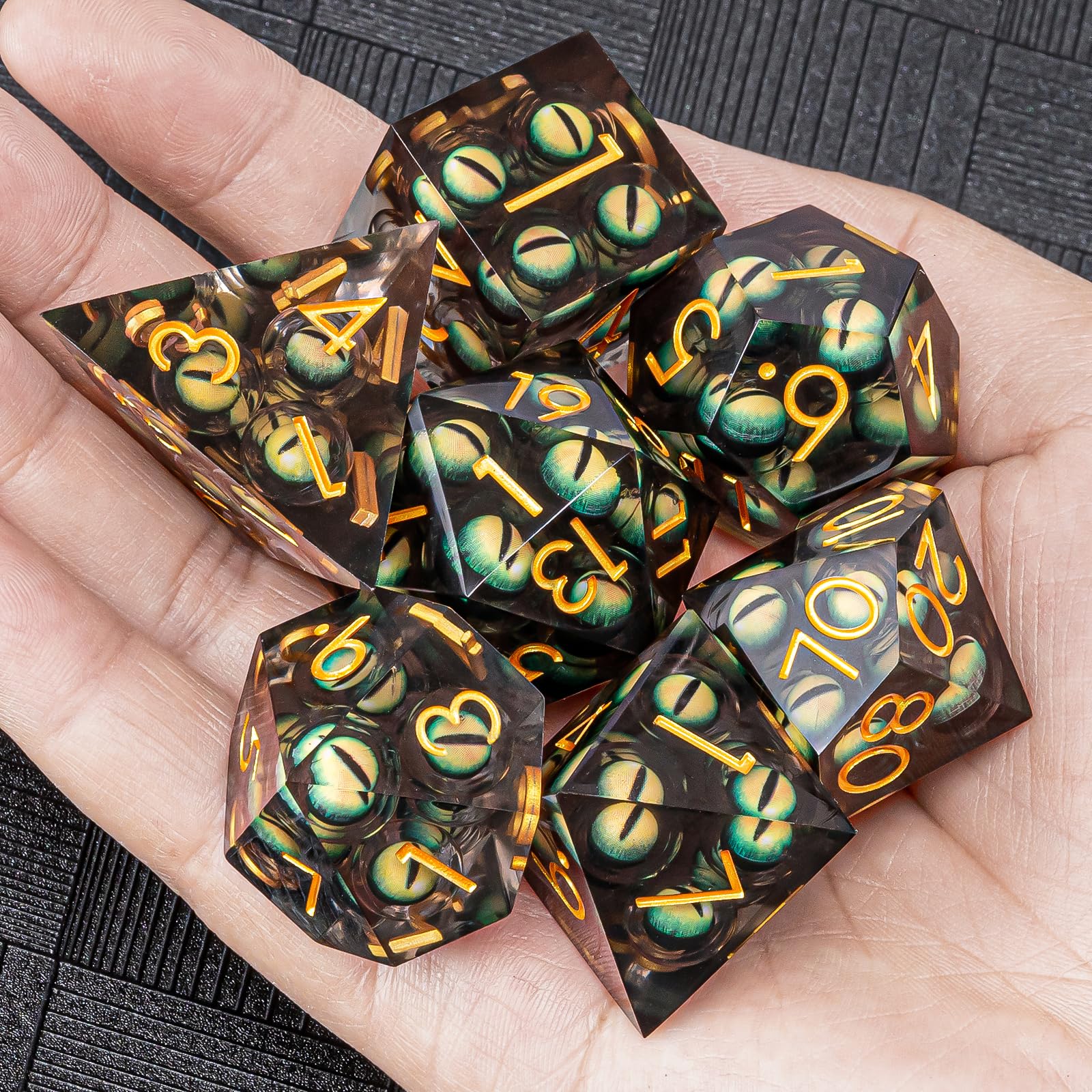 Beholder’s Dragon Eye – Juego de dados DND de ojo de dragón, resina líquida de borde afilado, hechos a mano, con caja de regalo, 7
